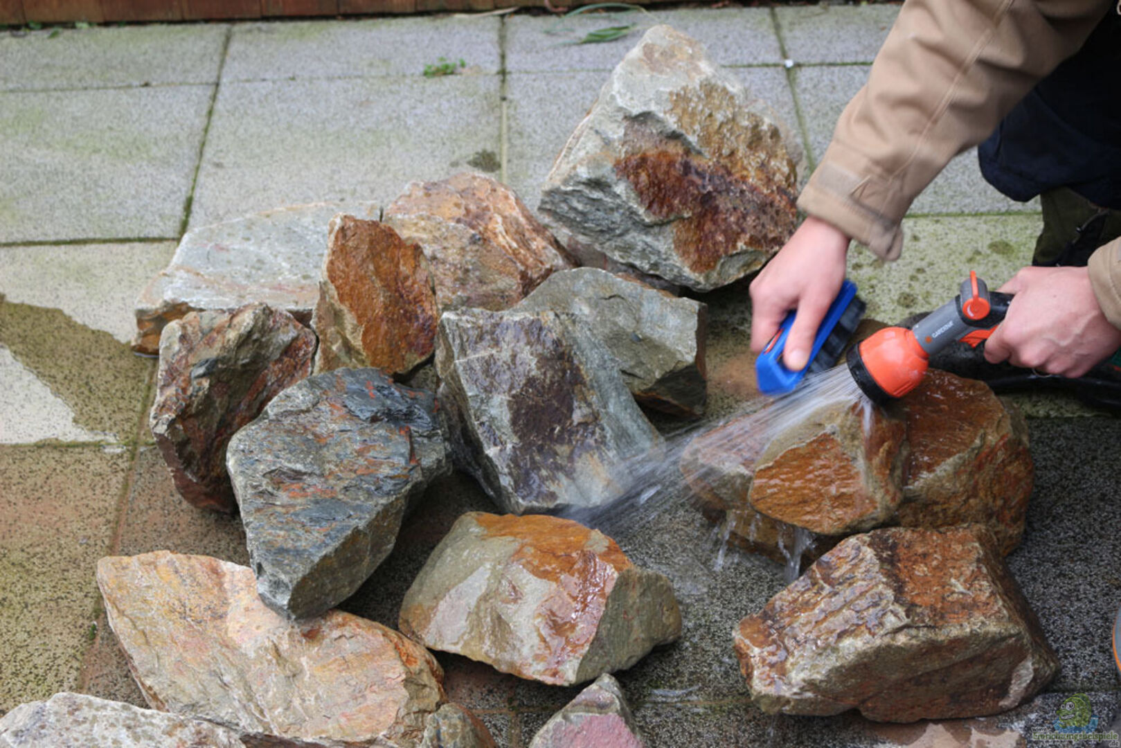 Bruchstein ca. 160 kg (nicht alle haben es ins Becken geschafft) Es wurden Handelsübliche Bruchsteine gekauft, die auch im Teichbau benutzt werden, diese sind in verschiedene Grö??en (bis 15 bis 40 cm) und haben Natureinschlüsse. Beim "dekorieren" wurde ein Glasschutz unter den Steinen gesetzt und besonders darauf geachtet, das genügend Möglichkeiten zur Revierbildung vorhanden sind. Alle Fische können aus dem Sichtfeld verschwinden/ sichverstecken, was uns sehr wichtig [...]