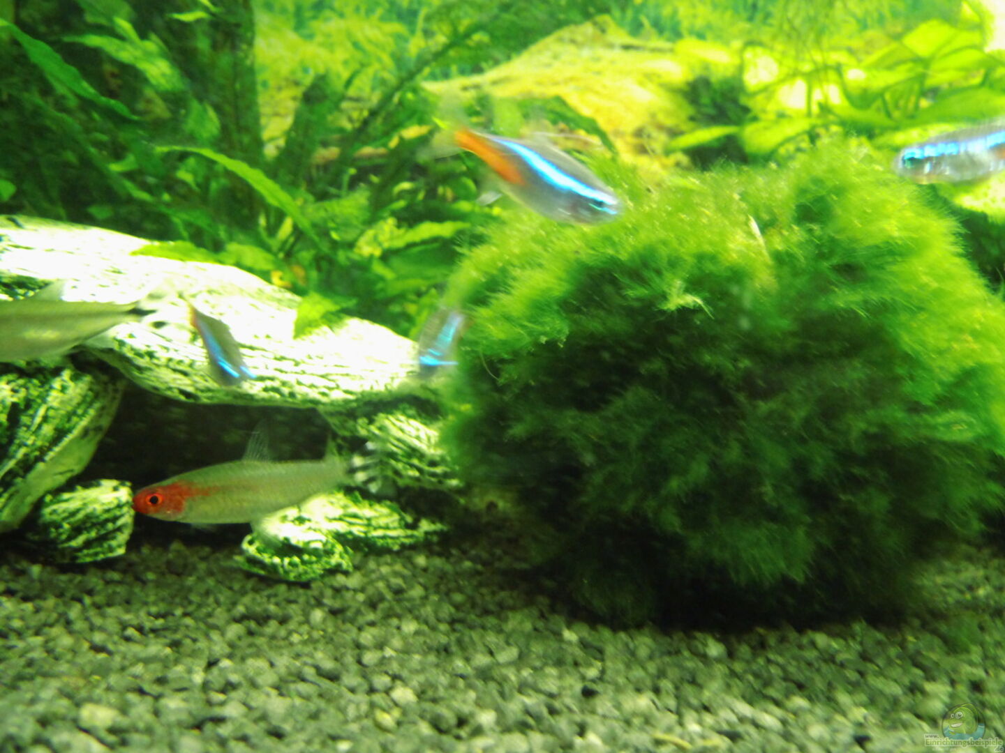 6 Rote Neon (Paracheirodon axelrodi) 3 Rotnasensalmler (Hemigrammus bleheri) (es waren mal mehr, leider sind schon welche gestorben) 3 Kupfersalmler (Hasemania nana) (es waren mal mehr leider sind schon welche gestorben.) 0/1 Guppy (Poecilia reticulata) 1/1 Ancistrus sp. + viele Babys 3 Ohrgitter Harnischwelse (Otocinclus hoppei) _____ 18 ausgewachsene Fische Artenbeschreibungen: Roter Neon (Paracheirodon): Natürlicher Lebensraum: Klare Gewässer, Rio Negro, Orinoko Wasserwerte: [...]