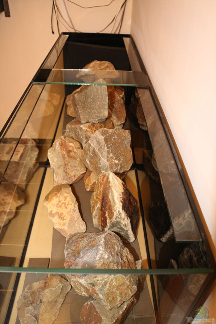 Bruchstein ca. 160 kg (nicht alle haben es ins Becken geschafft) Es wurden Handelsübliche Bruchsteine gekauft, die auch im Teichbau benutzt werden, diese sind in verschiedene Grö??en (bis 15 bis 40 cm) und haben Natureinschlüsse. Beim "dekorieren" wurde ein Glasschutz unter den Steinen gesetzt und besonders darauf geachtet, das genügend Möglichkeiten zur Revierbildung vorhanden sind. Alle Fische können aus dem Sichtfeld verschwinden/ sichverstecken, was uns sehr wichtig [...]