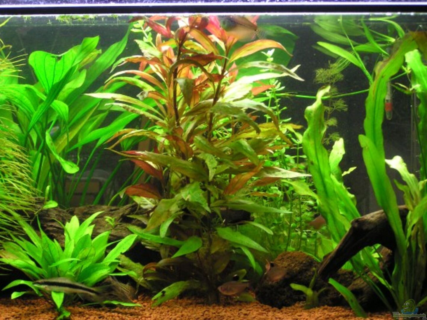Mehrere Moorkienwurzeln und Tonhöhlen. Becken ist mit Plexiglas abgedeckt, da die Schmerlen und Siamensis gerne springen.