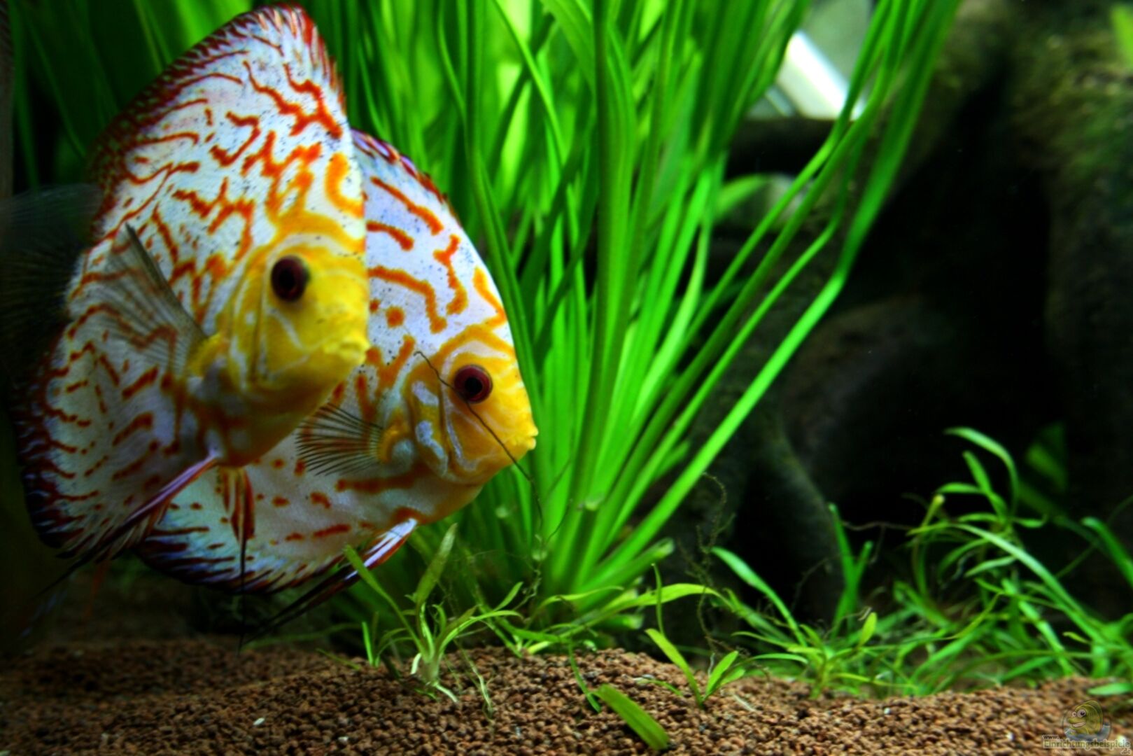5 Disken (Symphysodon aequifasciatus) 2 x Pigeon blood blau, 1 x Santarem, 2 x Rot-Türkis Herkunft: Südamerika Grösse: 15 - 20 cm (im Durchmesser) Haltung: in Gruppen (5-8 Tiere) Wassertemperatur: 26 - 30°C Wasserwerte: GH 0-30, KH 0-25, PH-Wert 4, 0-8, 3 (diese Werte gelten nur für Stendker-Diskus, da die Tiere in diesem Wasser aufwachsen) (Quelle: Diskuszucht Stendker.de) Futter: Diskus-Spezial-Trockenfutter, Frostfutter (Mückenlarven, Artemia, Tubifex), Lebendfutter [...]