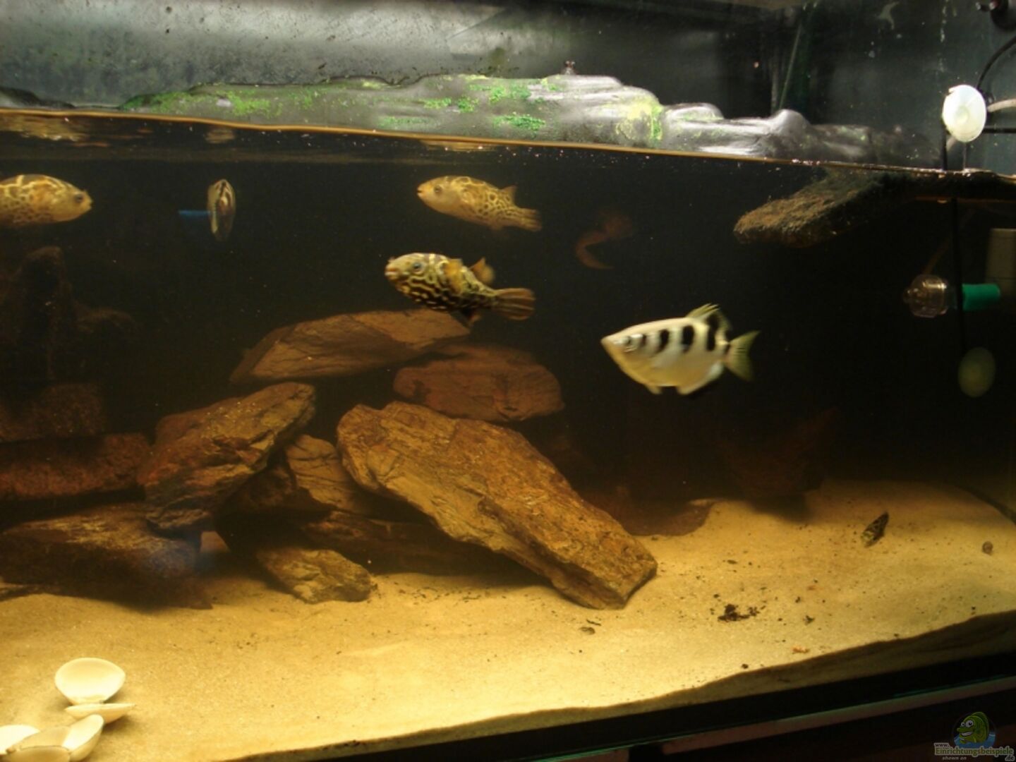 Da wir wegen der Speziellen Fischarten Verstecke und Rückzugsmöglichkeiten benötigen, haben wir uns für verschiedene Steinaufbauten Mangrowenwurzeln entschieden. Ein Bachlauf aus dem Baumarkt dient als künstlicher Landteil. Er ist ebenfals mit Qwarzsand gefüllt. Steine und kleine Wurzeln dienen als Liegeplätze der Bewohner.