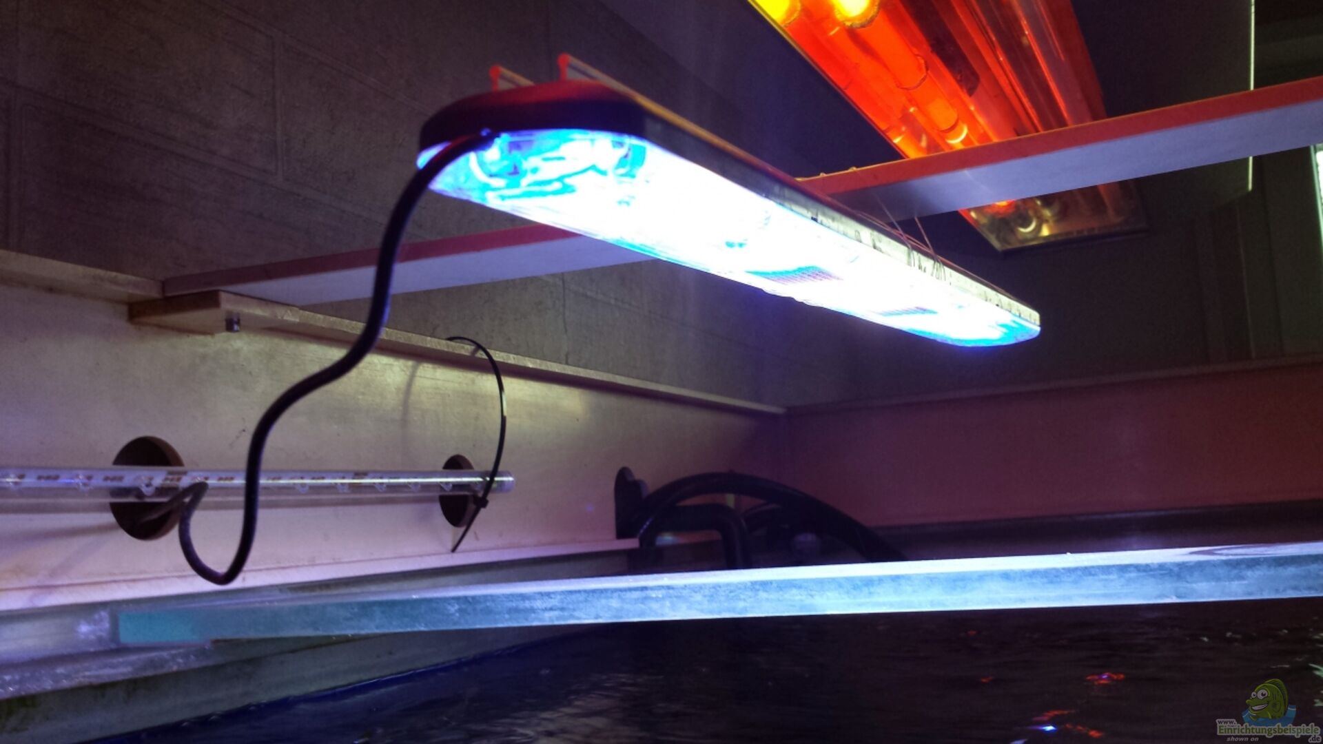 Strömungspumpe: TUNZE Turbelle stream 6065 Strömungspumpe für Aquarien von 250 bis 800 L, ca. 6.500 l/h, 12 Watt. Strömungszeiten verteilt durch den Tag: 1h Betrieb danach 1h Pause, 2h Betrieb/2h Pause etc. siehe Bild.