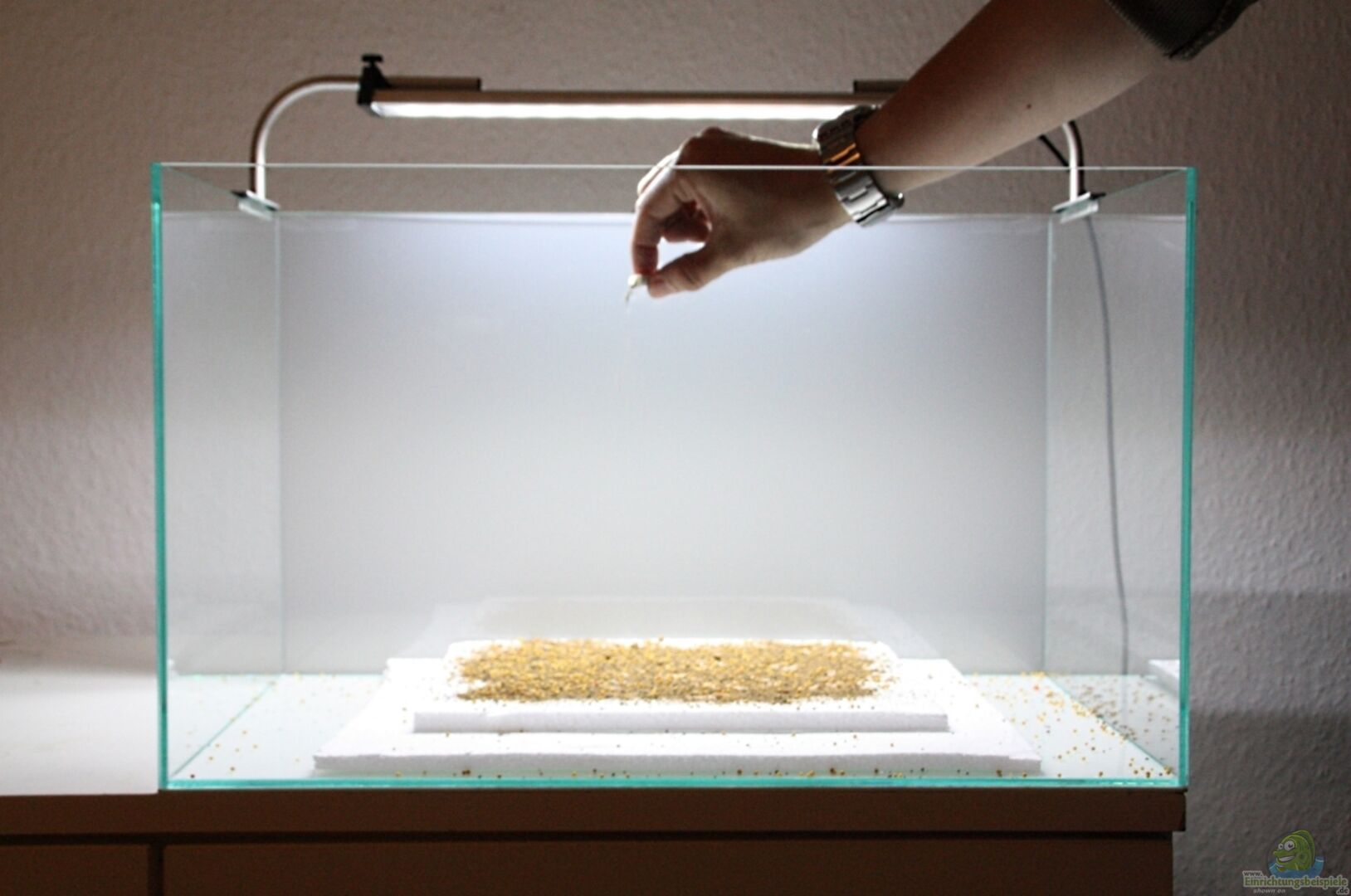 -ein sehr schönes, transparent verklebtes Poolaquarium (ohne Streben). Die Nähte sind nur hauchdünn verklebt. -Als Hintergrundfolie eine Milchglaslampenschirmfolie aus dem Bastelgeschäft. -Auf Empfehlung von Herrn Just hab ich statt Styropor nun eine wei??e Moosgummiplatte unter dem Becken. Hier gibt es eine detaillierte Fotostrecke zum Aufbau: