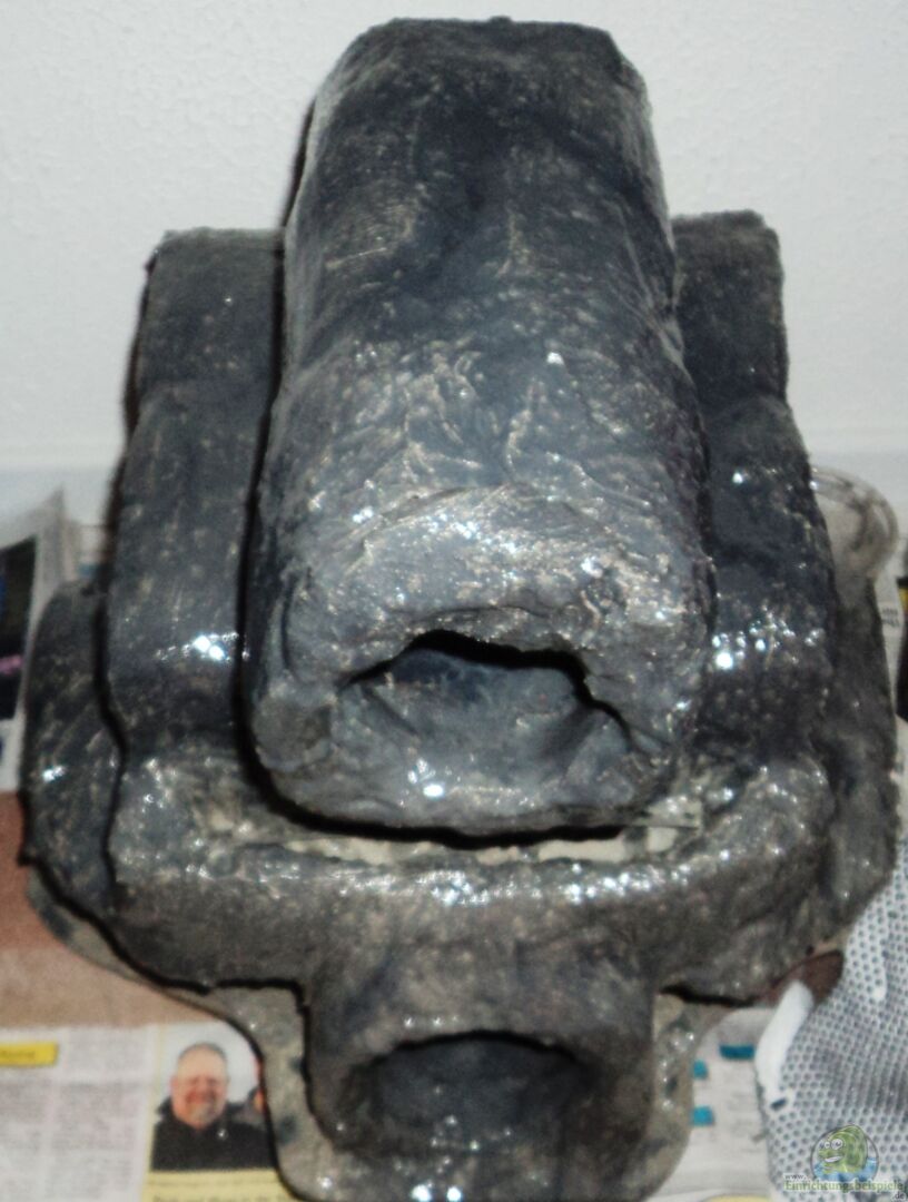 Erst mal zu dem Felsen. Der Felsen ist aus 5 Tonröhren gebaut und steht auf einer 1, 5 cm dicken Plexiglasplatte. Die Ma??e sind b. ca. 40 cm x 40 cm, h. ca. 45 cm. Der Felsen ist mit Aquariumsilikon zusammen geklebt, dann mit Fliesenkleber überzogen. Für die Befestigung der Pflanzen habe ich Edelstahlband mit eingearbeitet wo denn die Pflanzen mit Angelschur festgebunden werden. Der Felsen ist dann mit 3 Schichten Epoxidharz versiegelt. In der Reinfolge hellgrau ??? dunkelgrau & schwarz. [...]
