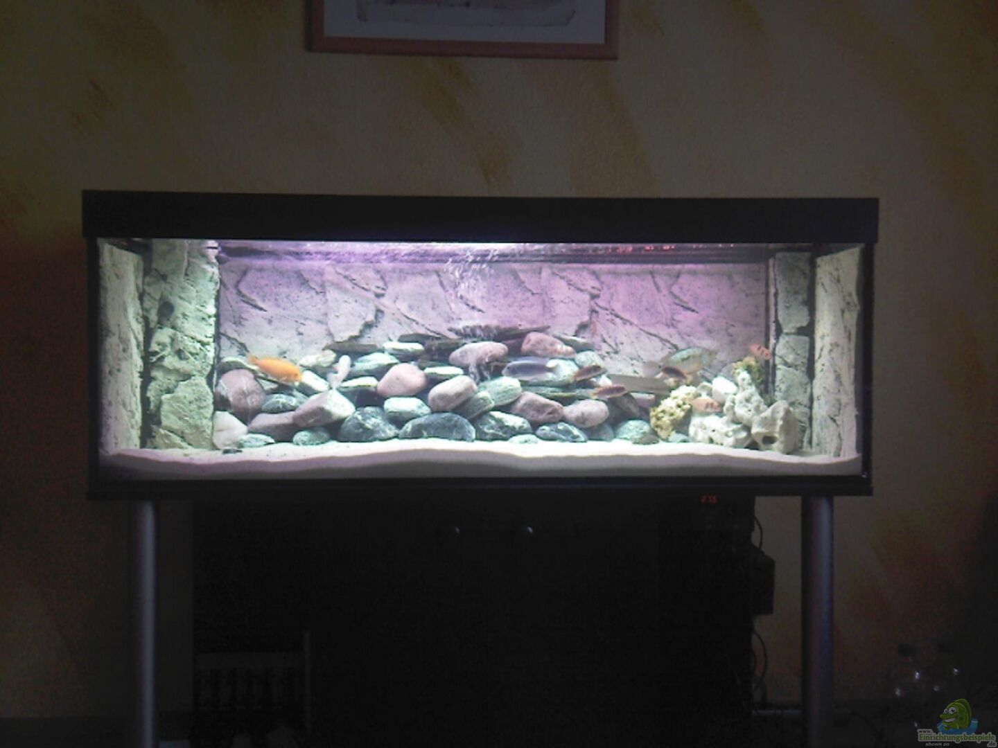 Aquarium aus 12mm Glas. Stossverklebt mit schwarzem Silikon, einer zusätzlichen Sicherheitsnaht innen und in der Mitte mit einer Querstrebe verstärkt.