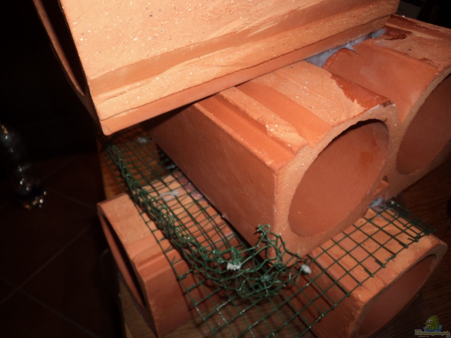 Erst mal zu dem Felsen. Der Felsen ist aus 5 Tonröhren gebaut und steht auf einer 1, 5 cm dicken Plexiglasplatte. Die Ma??e sind b. ca. 40 cm x 40 cm, h. ca. 45 cm. Der Felsen ist mit Aquariumsilikon zusammen geklebt, dann mit Fliesenkleber überzogen. Für die Befestigung der Pflanzen habe ich Edelstahlband mit eingearbeitet wo denn die Pflanzen mit Angelschur festgebunden werden. Der Felsen ist dann mit 3 Schichten Epoxidharz versiegelt. In der Reinfolge hellgrau ??? dunkelgrau & schwarz. [...]