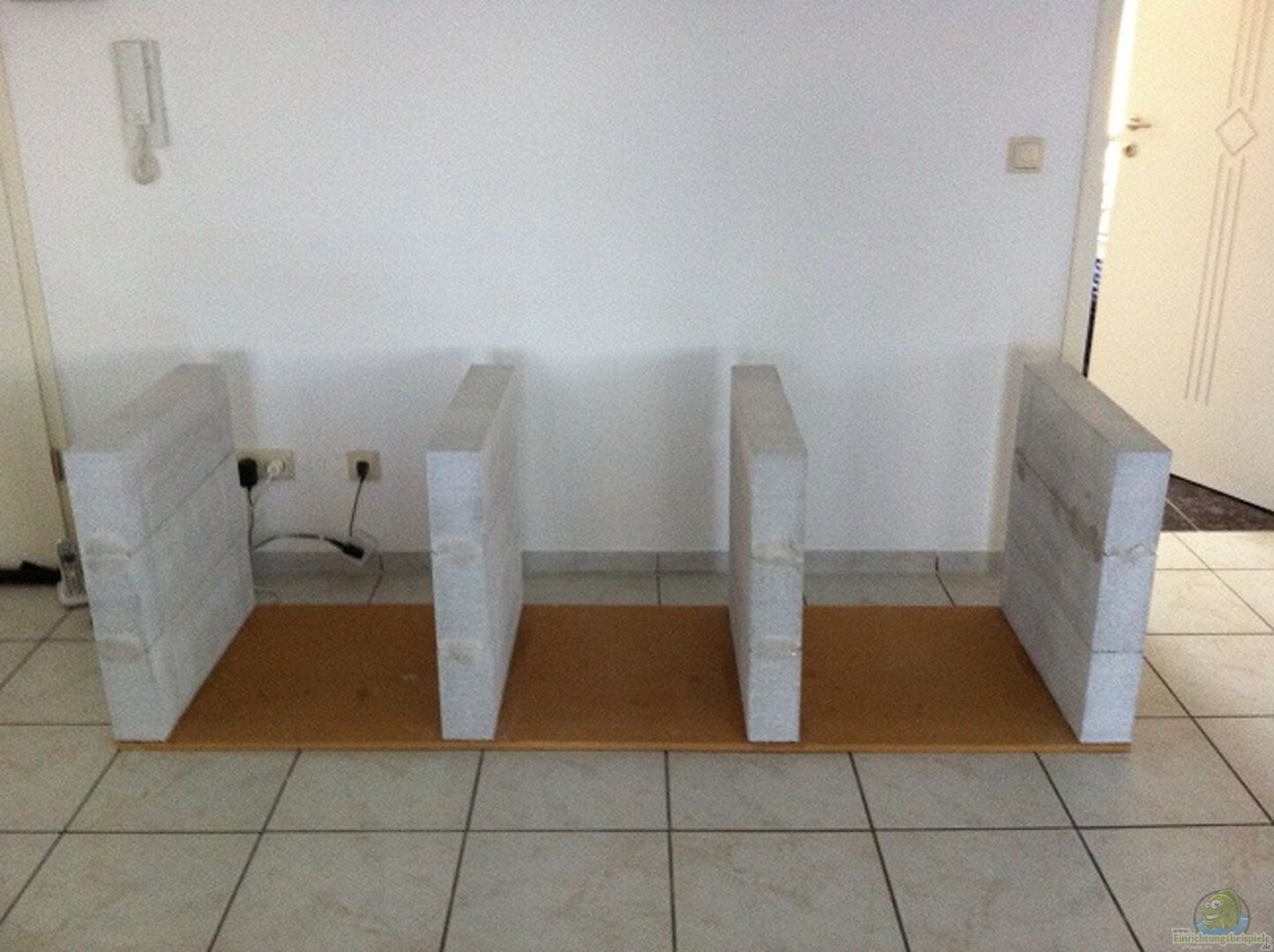 Sonderanfertigung 12 mm starken Floatglas sto??verklebt. Innen mit Sicherheitsnaht, Unterbau mit 17, 5cm Ytong-Steinen und 5cm Steine an der Rückseite. Alles Komplett geflie??t. 5cm Multiplexplatte
