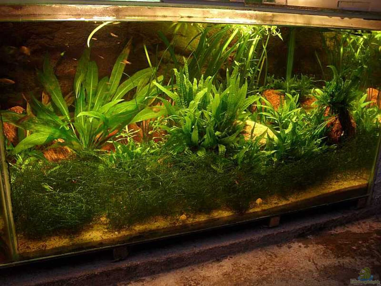 Das Becken besteht nicht mehr so, soll nur als Beispiel dienen!!!!! Aquarium gekauft, Lampe und Filter Marke Eigenbau, Abdeckung durch Deckscheiben, Schrank vom Möbeltischler angefertigt, Bodenscheibe mit transparentem Aquariensilikon beschichtet und mit Quarzsand bestreut. Dadurch keine spiegelnde Bodenscheibe und gleich eine druckhemmende Unterlage für Steinaufbauten.