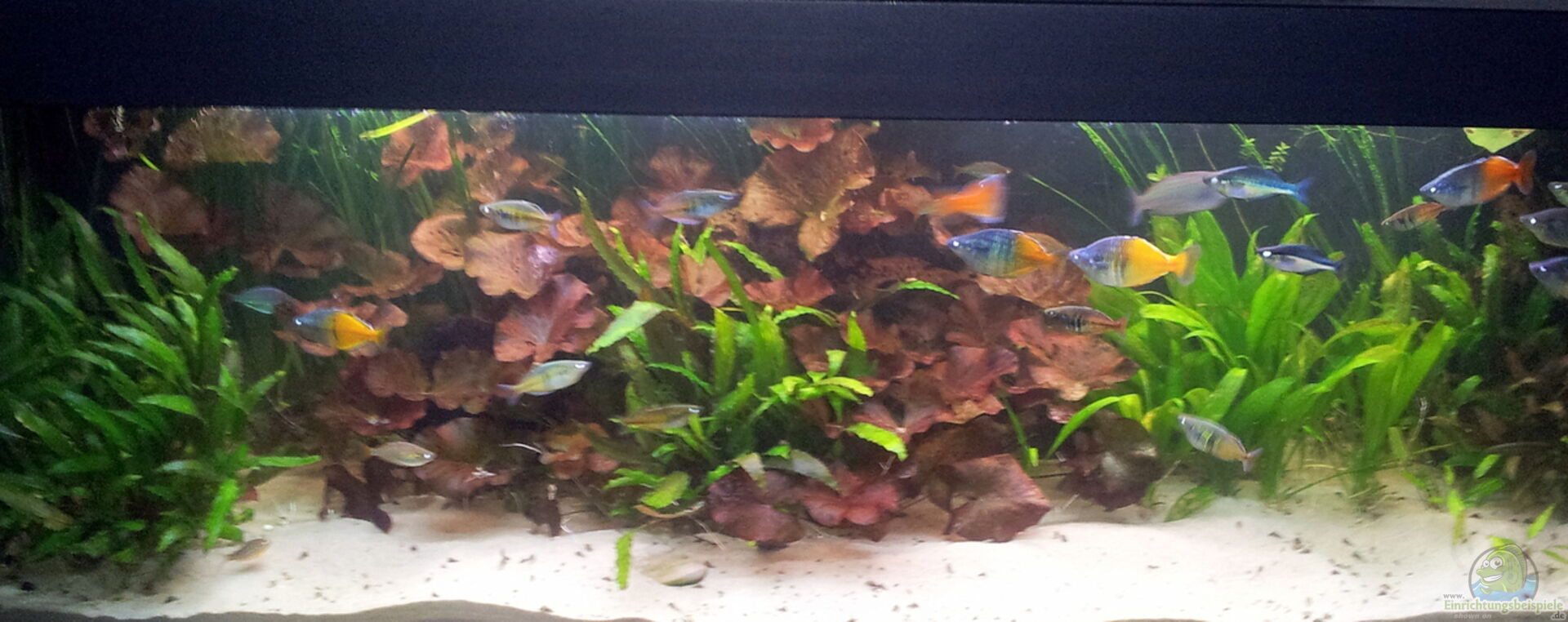 * Klassisches Rechteckaquarium mit stabilisierter Anrichte aus Holz als Unterschrank. * Als Rückwand habe ich einfach schwarz-graues Krepppapier hinters Aquarium platziert und zwischen Glas und Papier ein paar künstliche Pflanzen geklemmt. Habe dadurch eine gute Tiefenwirkung erreicht. Die Valisnerien im Hintergrund passen gut dazu.