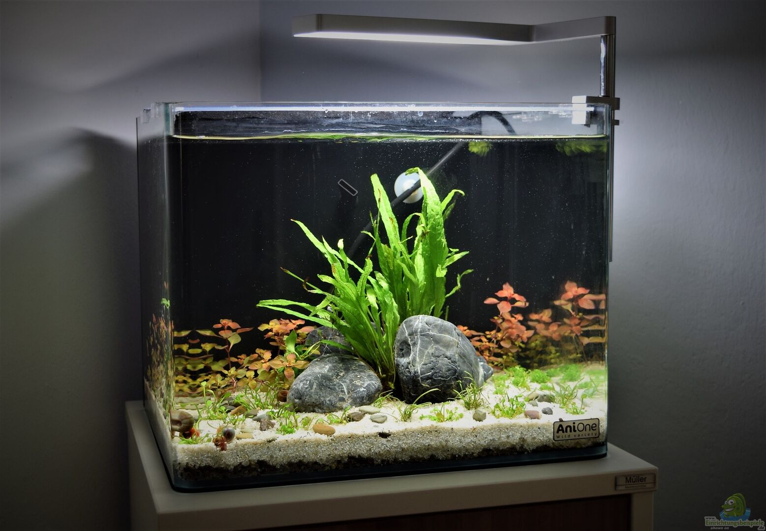 Bei diesem Aquarim handelt sich um ein Kompletset von Anione, welches mit Licht, Heizstab, Pumpe, Matte, Weissglasbecken mit gerundeten Scheiben und einer Glasabdeckung ausgestattet ist. Im hintereren Teil befindet sich eine fest eingebaute Filterkammer, die man mit verschiedenen Filtermaterialien bestücken kann.