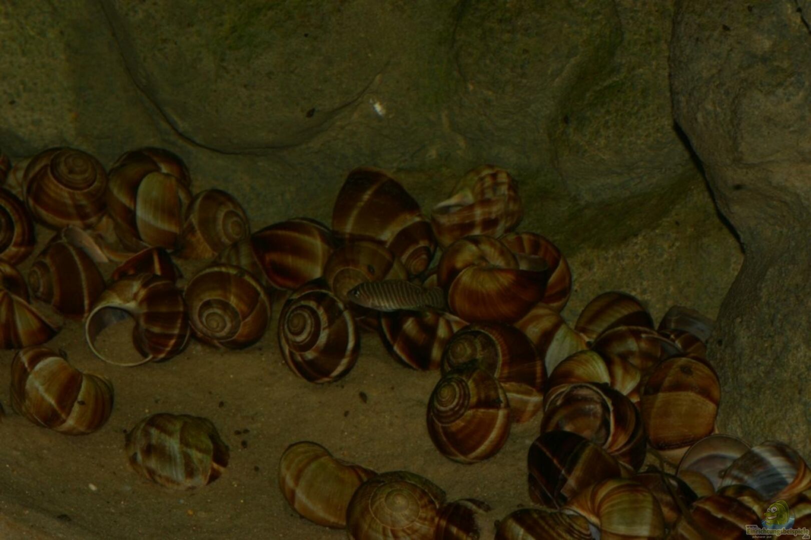 ca. 80 Schneckenhäuser (Weinbergschnecken aus dem Lebensmittelfachgeschäft) Die Betonrückwand habe ich weder farblich behandelt noch versiegelt, da auf ihr mit Sicherheit eine Menge Algen wachsen werden und Beton alkalisch ist, was den Wasserwerten nicht nur nicht schadet, sondern eher noch gut tut. Die Wand wurde auf einem Styroporträger mit Beton (1:3) modelliert und anschlie??end mit Zement sowie Sand bestreut. Das Styropor wurde ganz oder zu einem gro??en Teil geschmolzen und entfernt. [...]
