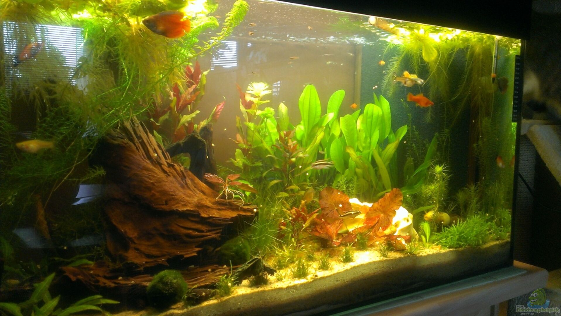 Links und Rechts sind unter den Querstreben Abdeckung vom Kabelkanal angeklebt. Der befindet sich auf Wasserspiegelhöhe und hält somit die Schwimmpflanzen in der linken und rechten Ecke. Schön für meine Fadenfische.