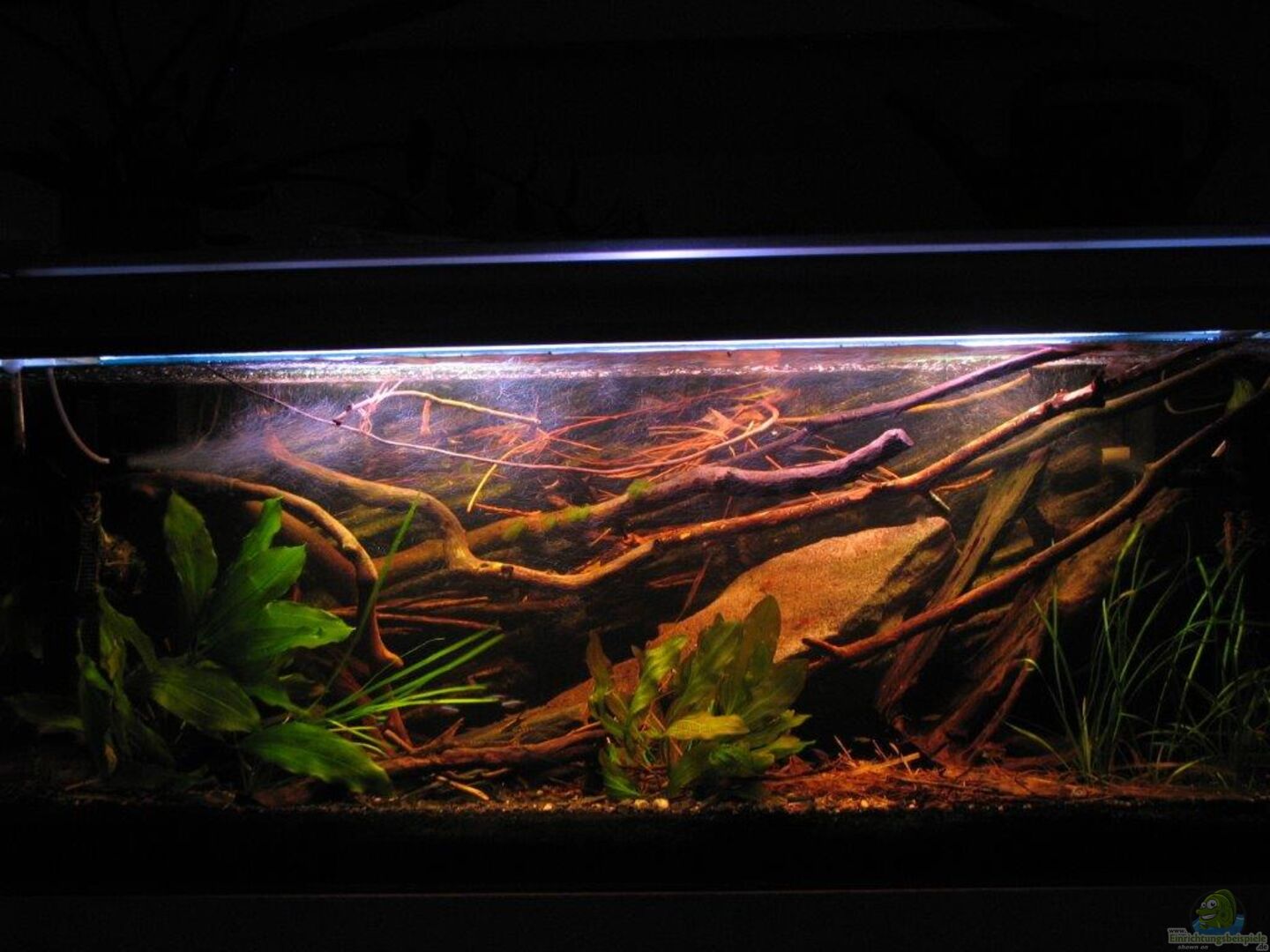 Standard Becken aus Float Glas, sto??verklebt mit Mittel- und Seitenstegen. Aquarien Aluminium Abdeckung "Stratos" von Gie??emann inkl. T5 Leuchtbalken. Momentan werden aber 2 T8 Leuchtbalken benutzt. Unterbau aus Ytong Steinen, verkleidet mit Sperrholz Pappel und wei??er Rauhfasertapete tapeziert. Daneben die Techniksäule aus Spanplatten, ebenfalls tapeziert. Verdeckt Filter, Kabel, UVC Klärer etc. und wird bei Bedarf einfach beiseite geschoben. Die Idee hinter der Gerstaltung: . [...]