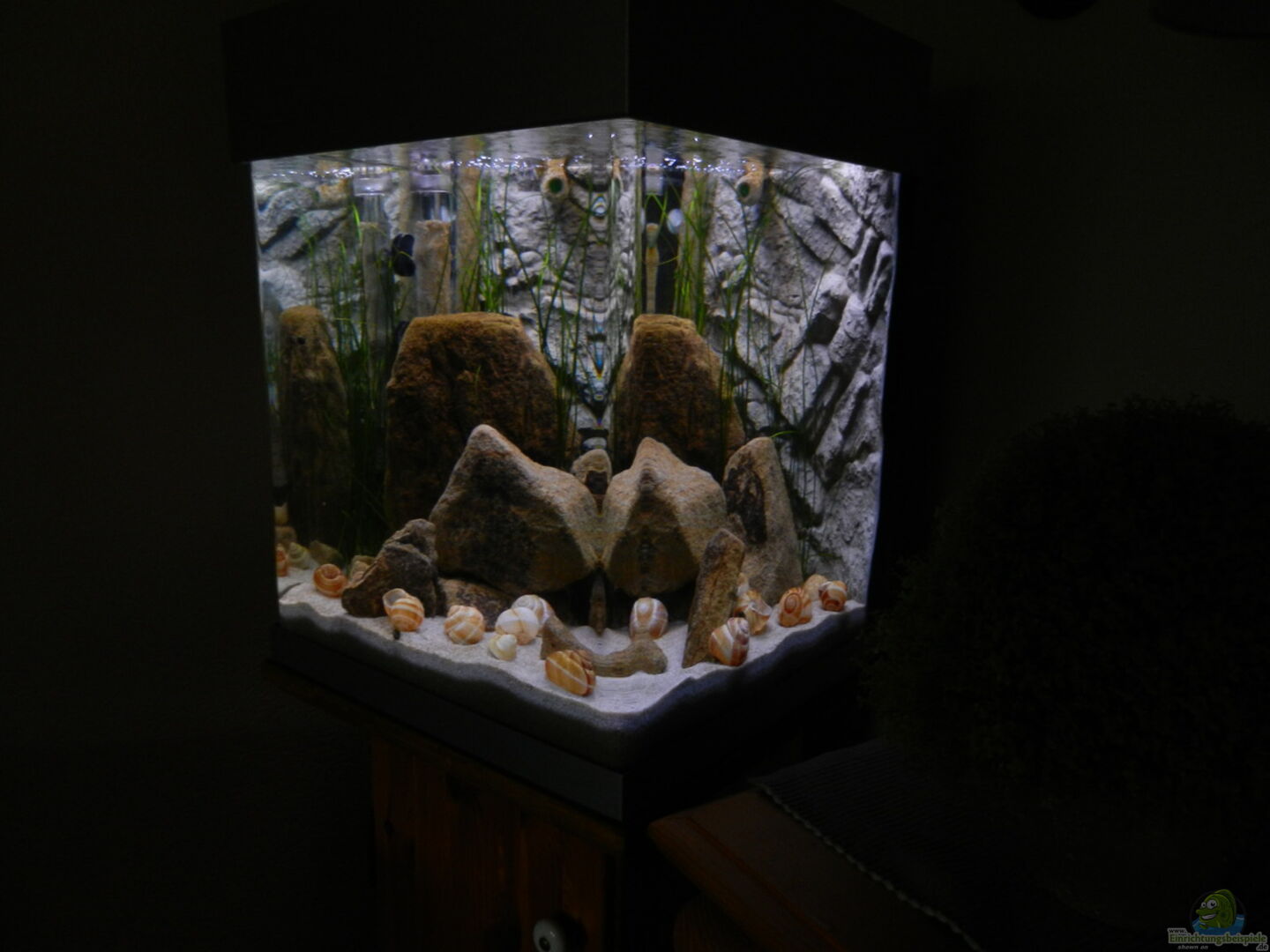 3 D Strukturrückwand Juwel Stone Lime (auf die Ma??e des Beckens zugesägt) und von innen an die Rückscheibe geklebt. Moorkienholz kleine Sandsteinbrocken