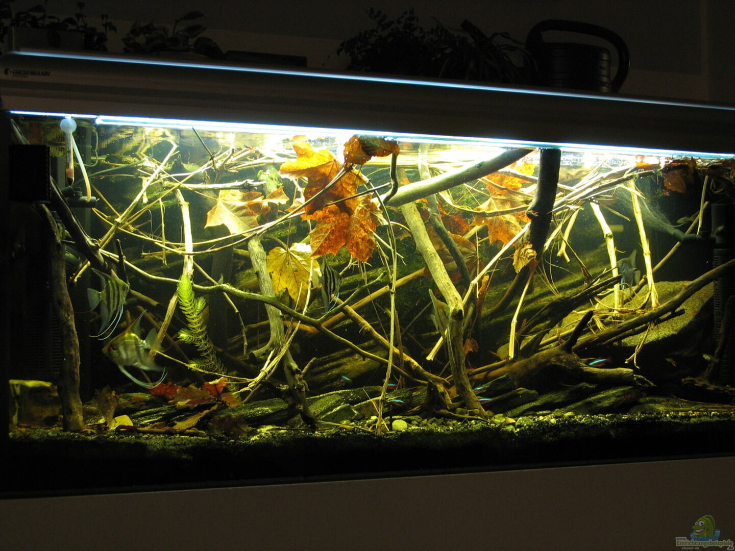Standard Becken aus Float Glas, sto??verklebt mit Mittel- und Seitenstegen. Aquarien Aluminium Abdeckung "Stratos" von Gie??emann inkl. T5 Leuchtbalken. Momentan werden aber 2 T8 Leuchtbalken benutzt. Unterbau aus Ytong Steinen, verkleidet mit Sperrholz Pappel und wei??er Rauhfasertapete tapeziert. Daneben die Techniksäule aus Spanplatten, ebenfalls tapeziert. Verdeckt Filter, Kabel, UVC Klärer etc. und wird bei Bedarf einfach beiseite geschoben. Die Idee hinter der Gerstaltung: . [...]