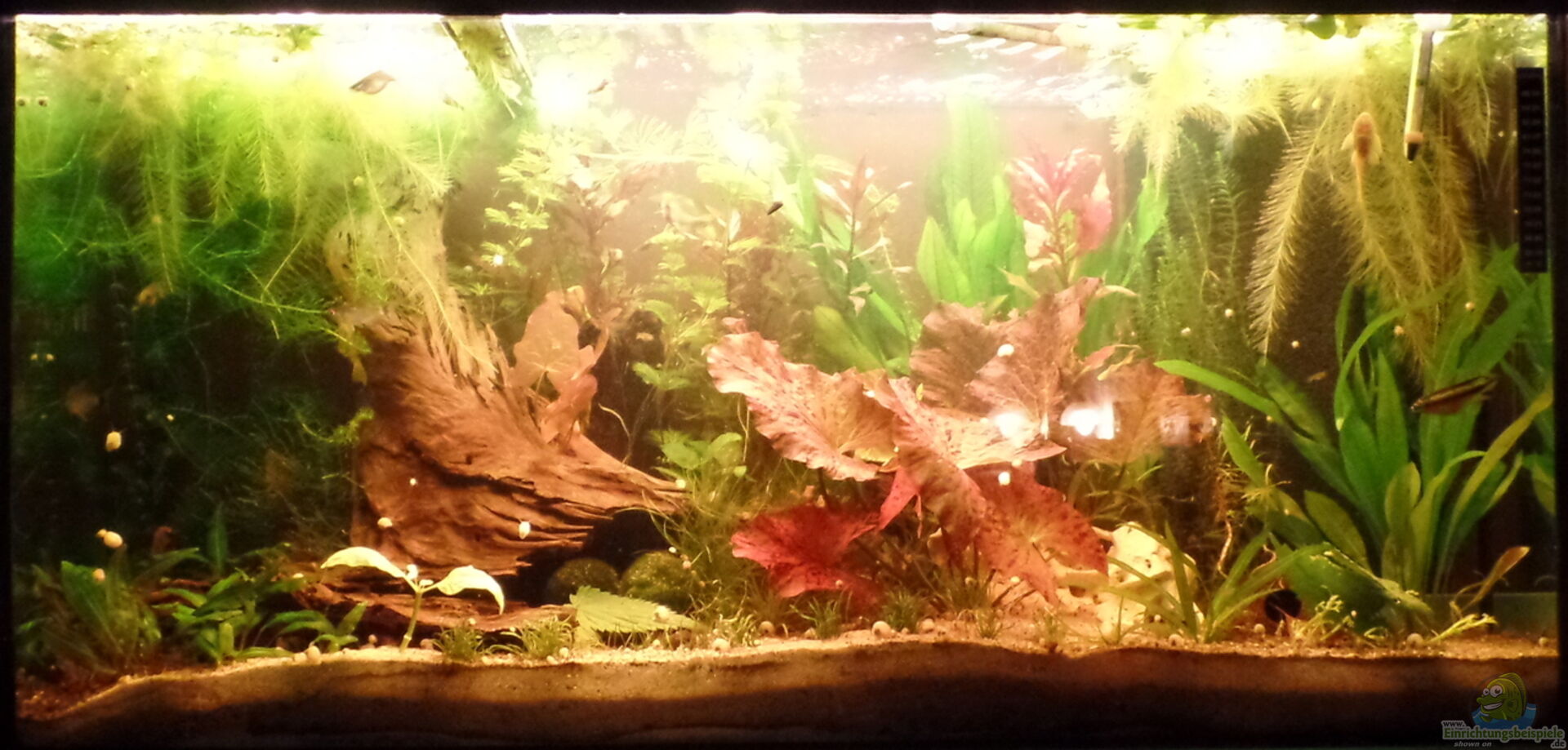 Links und Rechts sind unter den Querstreben Abdeckung vom Kabelkanal angeklebt. Der befindet sich auf Wasserspiegelhöhe und hält somit die Schwimmpflanzen in der linken und rechten Ecke. Schön für meine Fadenfische.