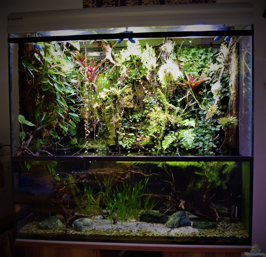 Sonderanfertigung von Aquarien und Terrarienbau Jebramek in Nürnberg. Der Wasserstand beträgt 35 cm. Ein mit Kabelbindern zusammen gebundenes Aluminium-Gestell befindet sich in der Abdeckung und fungiert als Decke, um darin Wurzeln anzubinden, die ebenso mit Kabelbindern zusammengehalten werden. Weiterhin hängen von der Decke künstlich erstellte Lianen. Sie wurden aus Paketschnur, Aquariensilion und einer Mischung aus gehäckselten Xaxim- und Weisstorf-Resten erstellt. Um das Ganze noch natürlicher [...]