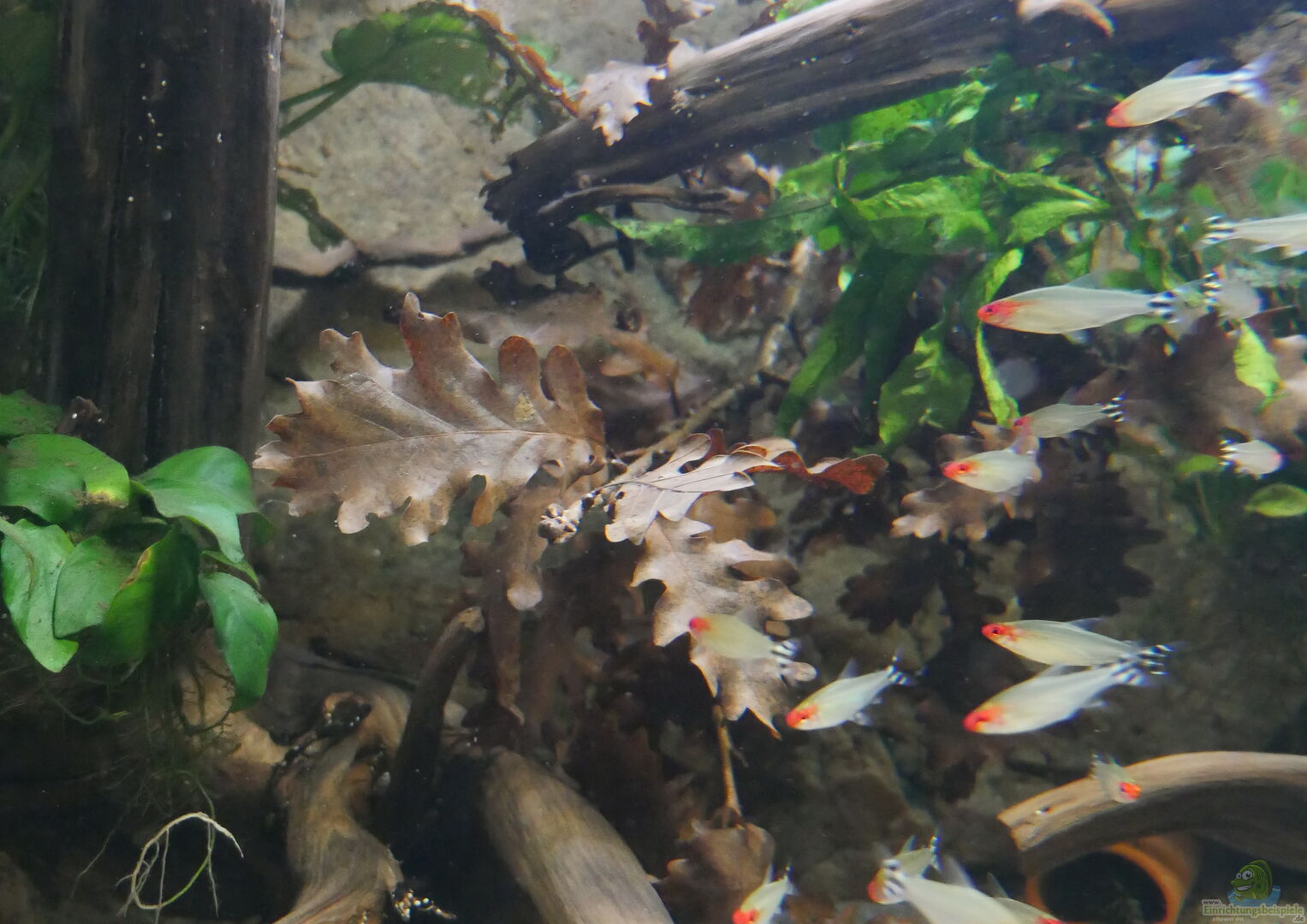 Diverse gut gewässerte Moorkienwurzel, z.T. von oben ins Wasser hängend, um den Diskus und Skalaren Unterstände zu bieten. Wenige kantengerundete Flusskiesel aus rotem Buntsandstein. Trockene, noch belaubte Buchen- und Eichenäste, die ganzjährig im Wald zu finden sind und von oben ins Becken gehängt werden. Dekorativ als farblicher Kontrast zu grünen Pflanzen und den Fischen und die wilden Kerle nutzen es als bevorzugten Unterstand, insbesondere Abends. Zudem wirkt das Laub, ähnlich wie [...]