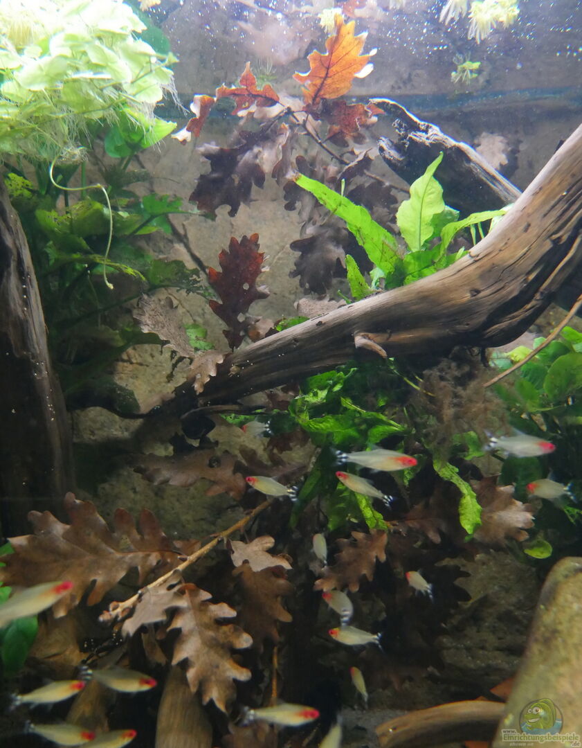 Diverse gut gewässerte Moorkienwurzel, z.T. von oben ins Wasser hängend, um den Diskus und Skalaren Unterstände zu bieten. Wenige kantengerundete Flusskiesel aus rotem Buntsandstein. Trockene, noch belaubte Buchen- und Eichenäste, die ganzjährig im Wald zu finden sind und von oben ins Becken gehängt werden. Dekorativ als farblicher Kontrast zu grünen Pflanzen und den Fischen und die wilden Kerle nutzen es als bevorzugten Unterstand, insbesondere Abends. Zudem wirkt das Laub, ähnlich wie [...]