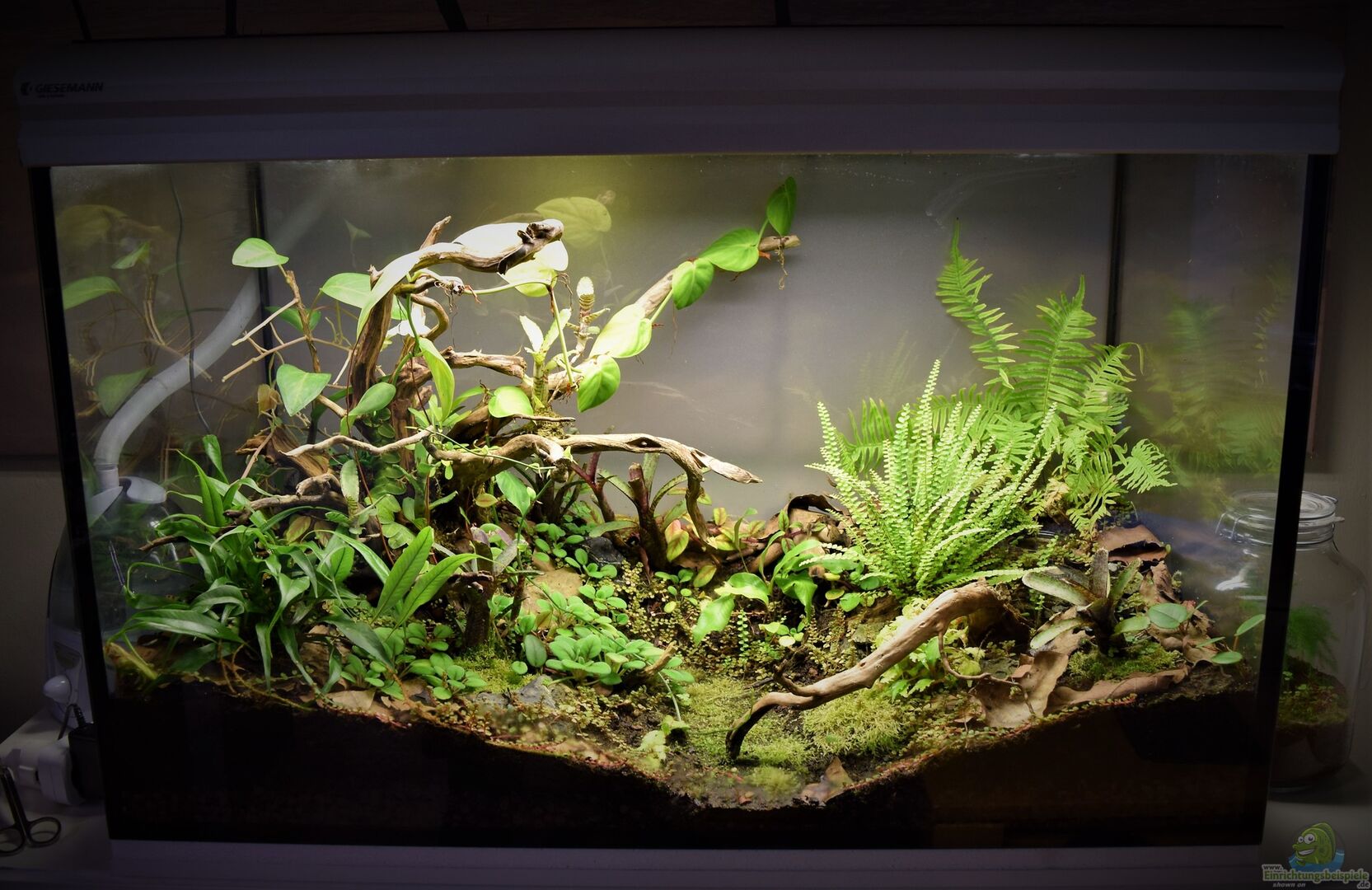 Die Besonderheit liegt darin, dass hier ein Aquarium als Terrarium gestaltet wird. Da kein Luftaustausch von unten nach oben durch Lüftungsschlitze stattfinden kann, wird hier mit PC-Lüftern gearbeitet, um dies zu bewerkstelligen. Der Gedanke war, freie Sicht auf das Terrarium zu haben, ohne störende Schiebscheiben, Lüftungsschlitze o.ä.