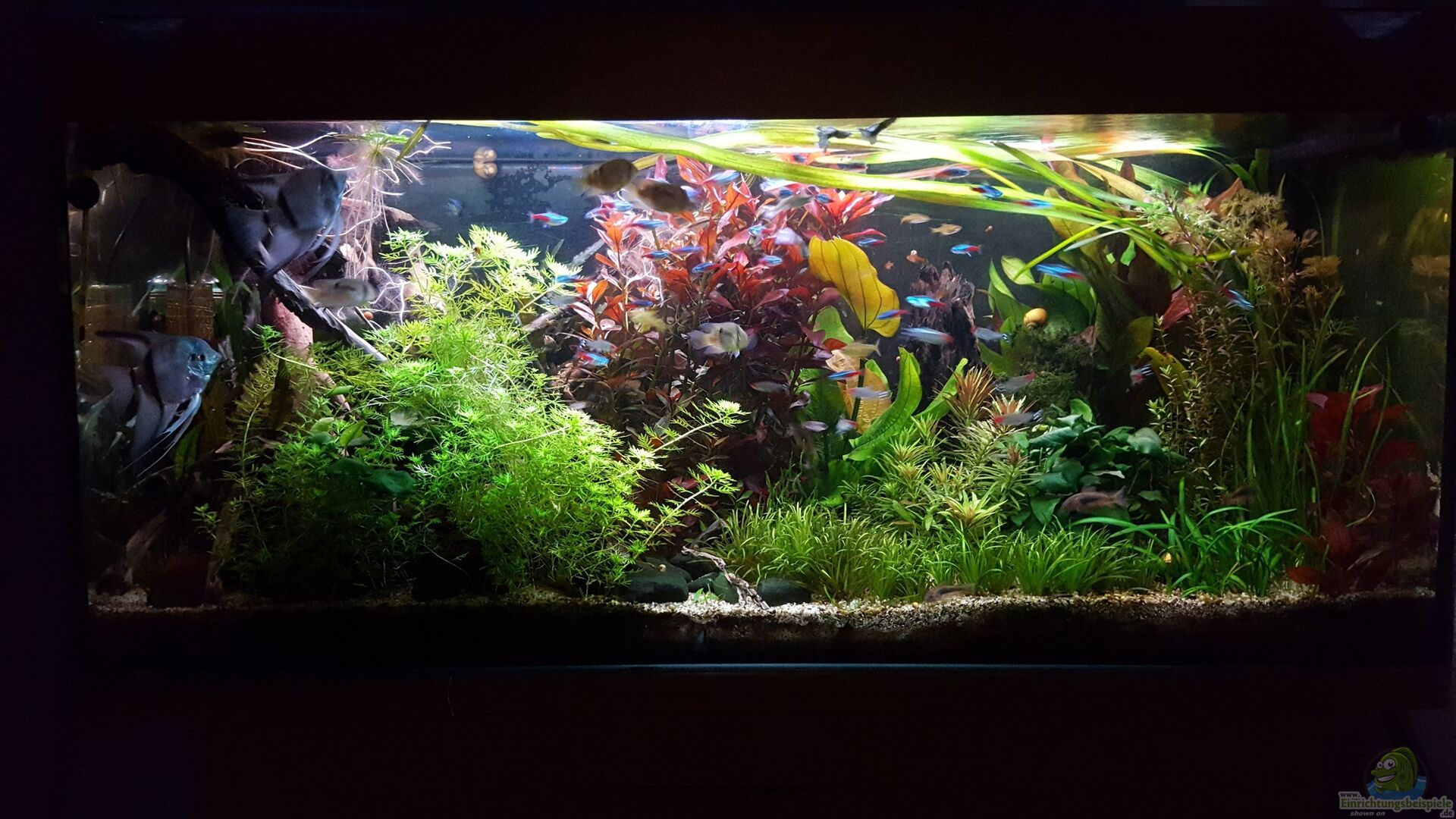Das Becken ist ein Floatglas Becken mit Sto??verklebung, hatte diese Jahrelang offen, nach dem Umzug habe ich mir dann eine Juwel Abdeckung besorgt, mit T8 Röhren ausgestattet. Habe diese später durch LED ersetzt Die Rückwand habe ich mit schwarzer Posterfolie abgedeckt. Da da Becken leider schon auf seinen Platz stand und schon eingerichtet, konnte ich diese leider nur schwer befestigen.