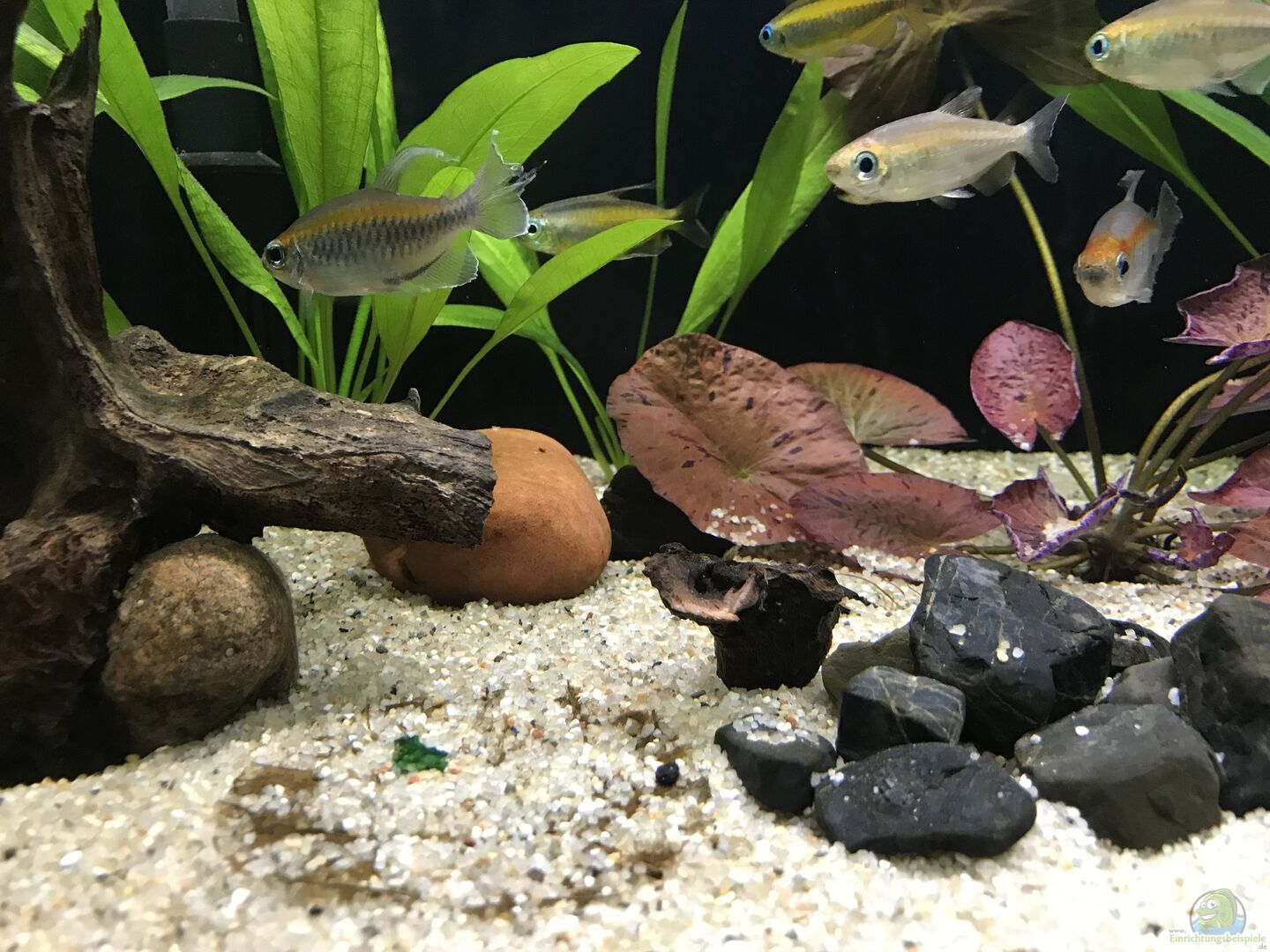 * 2 Moorkienwurzeln * 1 Tonhöhle für die Synodontis lucipinnis * 1 Kokosnusshöhle für die Pelvicachromis taeniatus * einige mittlere Kieselsteine aus der Ostsee (wurden am 18.11.24 entfernt und durch drei mittlere Grauwackensteine ersetzt). * drei mittelgroße Grauwackensteine * einige kleine schwarze Kieselsteine in größeren Gruppen am Boden * die Seitenwände und die Rückwand sind mit schwarzer Folie beklebt * einige Erlenzapfen * Buchen/Eichenblätter/Seemandelbaum [...]