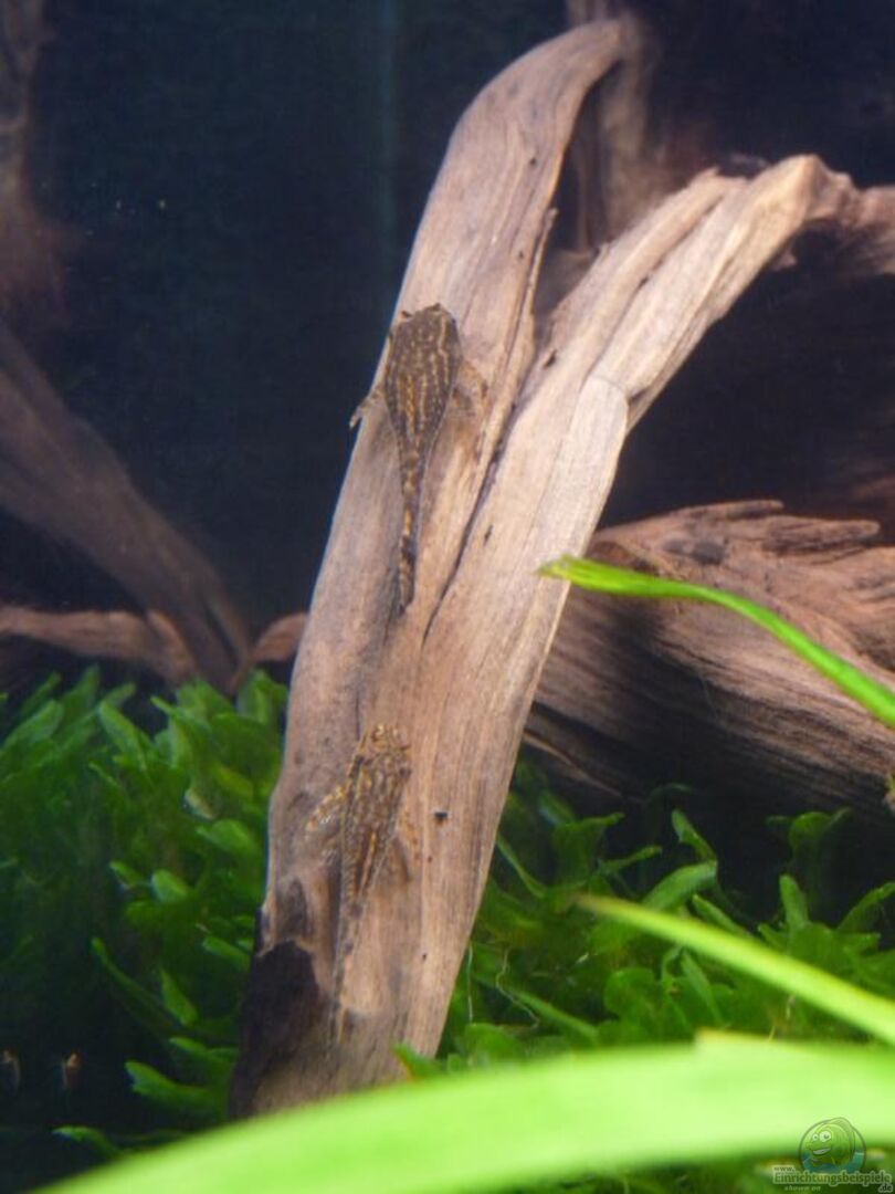 Borelli Buntbarsche (1 Weibchen, 1 Männchen); 13 Feuertetras, 3 Sternflecksalmler; 4 LG2 oder Otocinclus sp. Negro; eine unbekannte Anzahl Rückenstrichgarnelen und Red Fire Garnelen, Blasenschnecken, schwarze Turmdeckelschnecken, rote Posthornschnecken