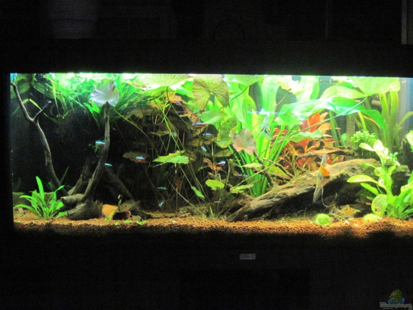 Typ: Juwel Rio 240. Das Becken steht als Raumteiler zwischen Wohn- und Essbereich. Es kann von 3 Seiten eingesehen werden, was die Gestaltung ziemlich erschwert, da es ja von allen Seiten einigerma??en gut aussehen soll. Eine Seitenwand (die an der Wand steht) wurde an der Innenseite des AQ mit "Struktur- Rückwand" von Juwel beklebt.