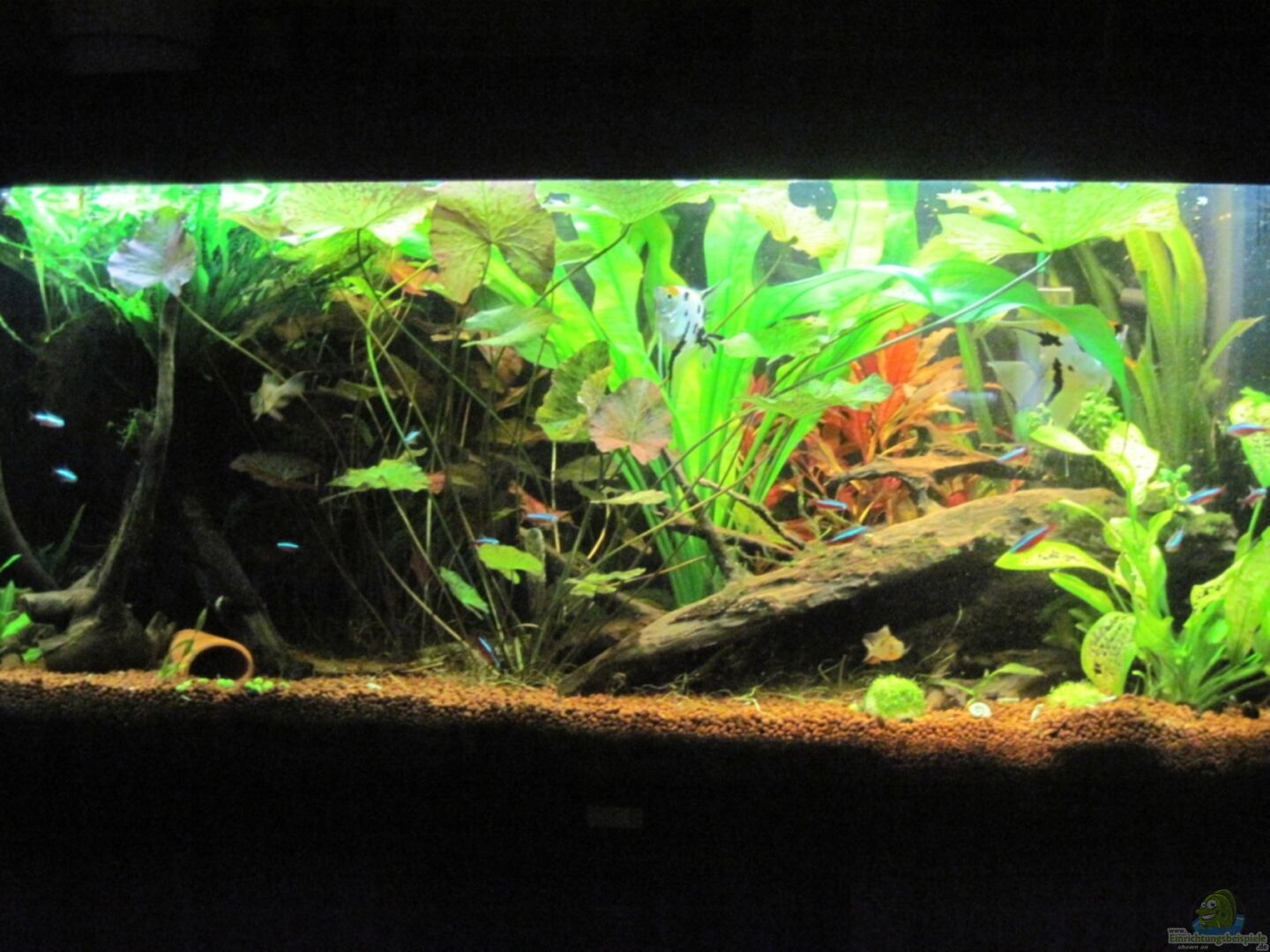 Typ: Juwel Rio 240. Das Becken steht als Raumteiler zwischen Wohn- und Essbereich. Es kann von 3 Seiten eingesehen werden, was die Gestaltung ziemlich erschwert, da es ja von allen Seiten einigerma??en gut aussehen soll. Eine Seitenwand (die an der Wand steht) wurde an der Innenseite des AQ mit "Struktur- Rückwand" von Juwel beklebt.