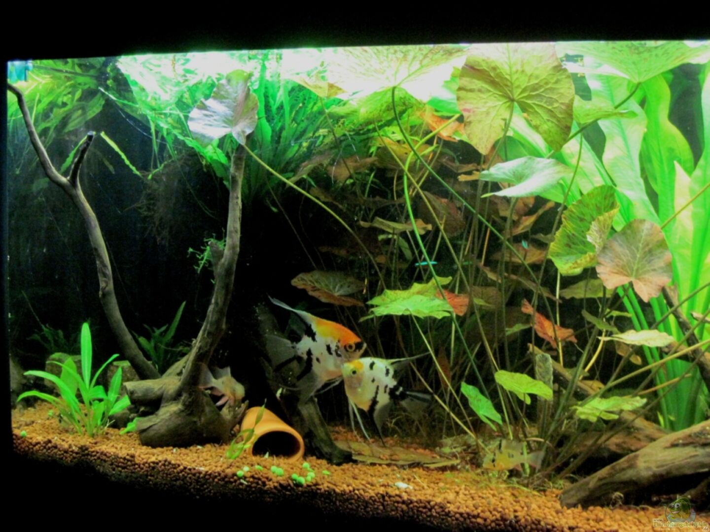 Typ: Juwel Rio 240. Das Becken steht als Raumteiler zwischen Wohn- und Essbereich. Es kann von 3 Seiten eingesehen werden, was die Gestaltung ziemlich erschwert, da es ja von allen Seiten einigerma??en gut aussehen soll. Eine Seitenwand (die an der Wand steht) wurde an der Innenseite des AQ mit "Struktur- Rückwand" von Juwel beklebt.