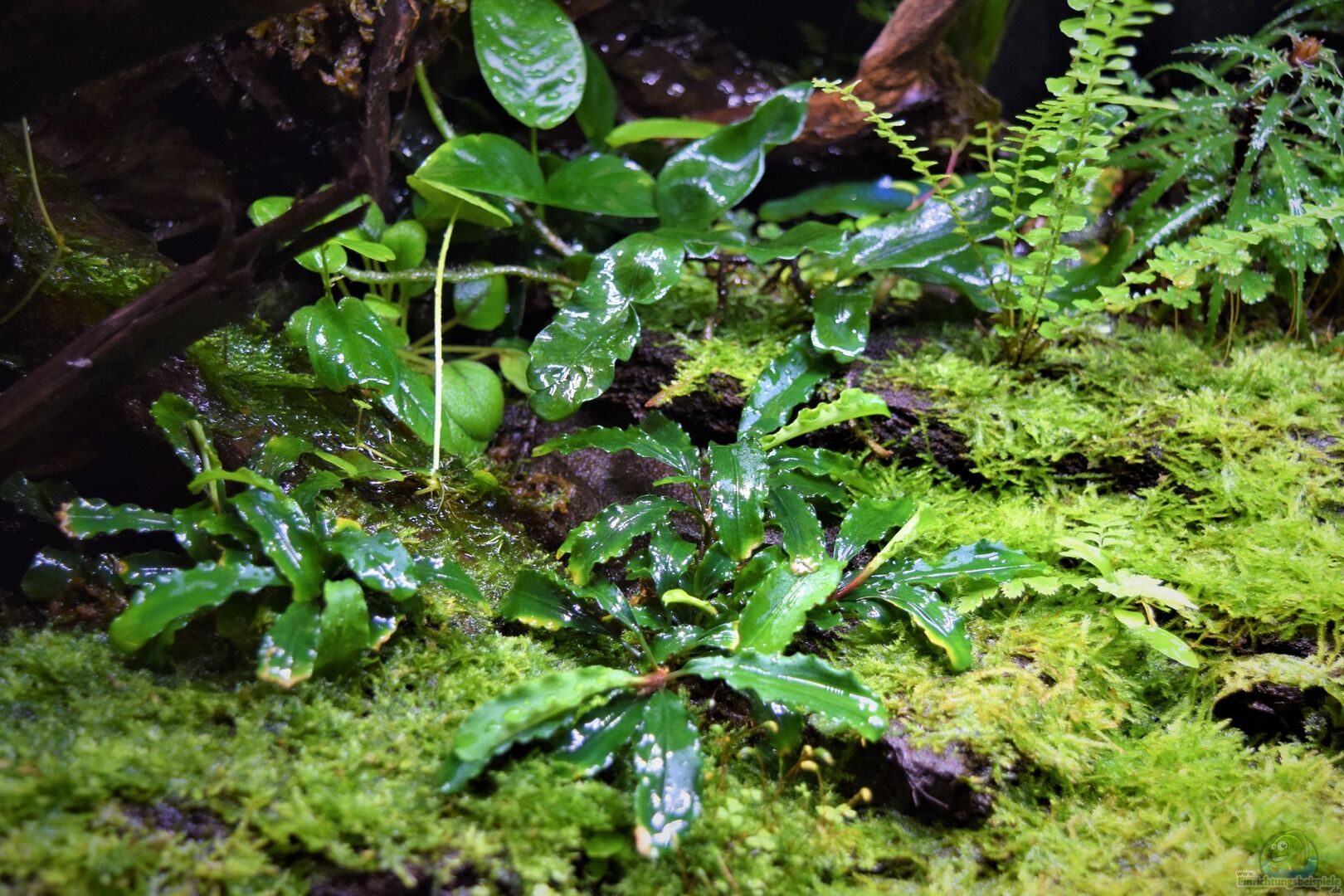 Ferns/Farne: Pyrrosia lanceolata, Selaginella unicata, Polypodium formosanum, Microgramma nitida Bromeliads/Bromelien: Neoregelia Hannibal, Neoregelia Fireball, Cryptanthus microglazioui Bodendecker/Ground plants: Bucephalandra spec. Green Velvet, Anubias bartei var. nana Mosses/Moose: Taxiphyllum barbieri, Leptodictyum riparium, Orchids/Orchideen: Barbosella cogniauxiana, Pleurothallis macroblepharis, Kletterer/Climbing plants: Ficus scandens, Epipremnum spec., Ficus punctata