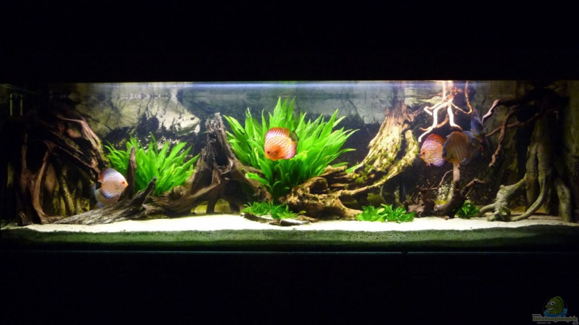 Standardbecken, sto??verklebt. Unterschrank und Abdeckung in Bucheoptik. Die Bodenscheibe ist von innen zum Schutz mit 1 cm Styropor beklebt (das Aquarium war früher mal ein Tanganjikabecken mit vielen Steinaufbauten). Auch das Becken selbst steht auf einer 1 cm Styropor-Schicht. Um die Standfläche der ganzen Kombination etwas zu vergrö??ern, steht der Unterschrank auf einer Arbeitsplatte. Damit soll die Last ein wenig gleichmä??iger auf dem Fu??boden verteilt werden.