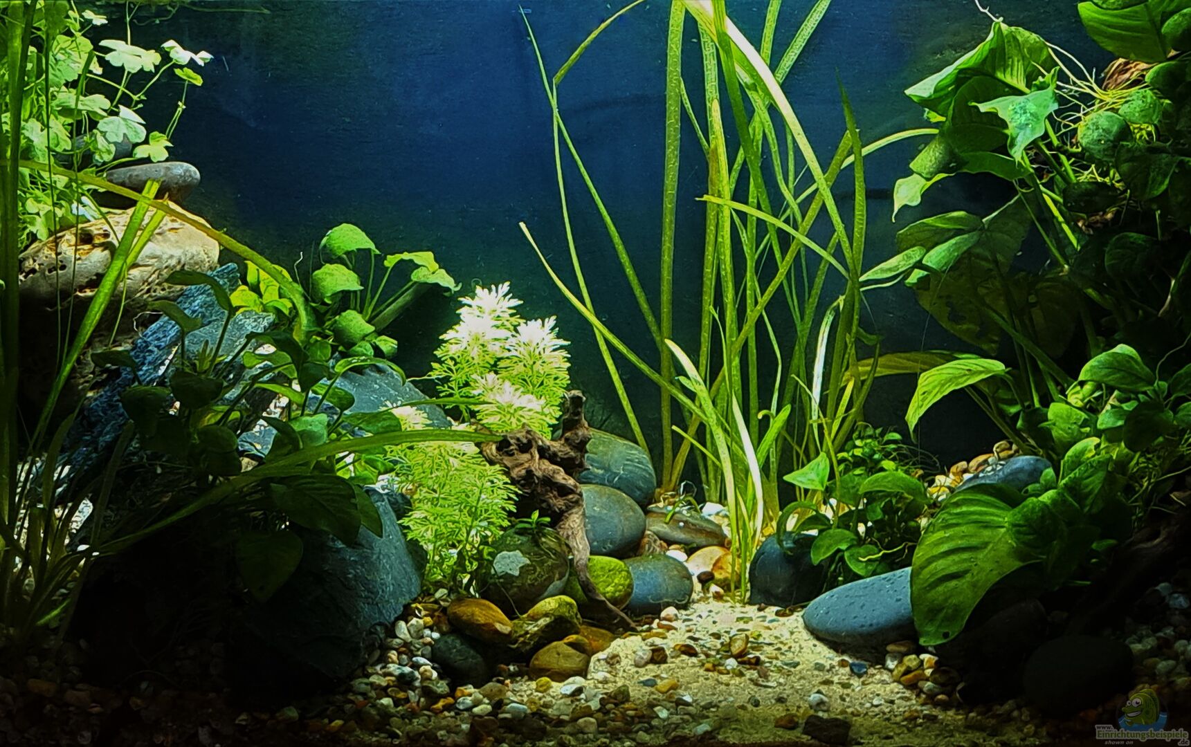 Der Bodengrund an der rechten Seite über 10 cm aufgeschüttet, es befinden sich Steinaufbauten im Becken und der Wasserstand ist um mehrere Zentimeter gesenkt( verdeckt durch eine Klebefolie) um dem Betta den Weg zur Oberfläche zu erleichtern. Die Einordnung in den Bereich Asien rechtfertigt sich hauptsächlich durch den Bewohner, weniger durch die Bepflanzung.
