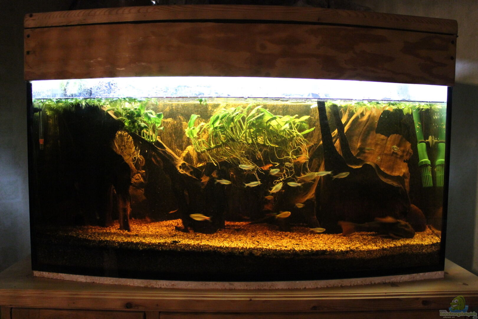 Nur noch als Beispiel, wurde im Februar 2016 neu umgestaltet Panoramabecken mit gebogener Frontscheibe Das Becken wurde am 26.01.2012 komplett neu umgestaltet. Es war seit 2004 ein Gesellschaftsbecken, das wirklich nicht mehr schön anzusehen war. Nach langer ??berlegung wurde daraus jetzt ein Südamerikabecken. Die Ecken links und rechts wurden mit grossen Wurzeln bestückt, um etwas dunklen Raum für die Welse zu schaffen. Die Mitte des Beckens ist etwas heller gehalten [...]