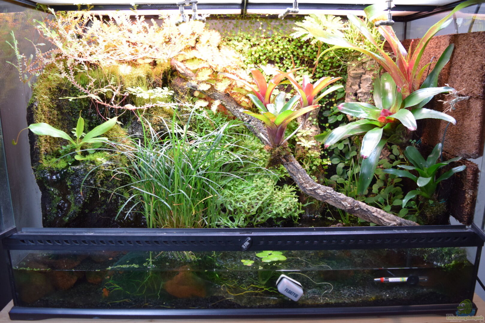 Rückwand besteht aus 1-2 cm dicken Xaxim-Platten (Neuseelandfarn), die mit Aquariensilikon festgeklebt wurden. Als weitere Deko-Elemente verwende ich hohle Korkeichenrinde, welche bepflanzt sind, Lava-Gestein und Weisstorfplatten. Die folgenden Bilder zeigen die Veränderung des Terrariums im Laufe der Zeit mit Datumsangabe.