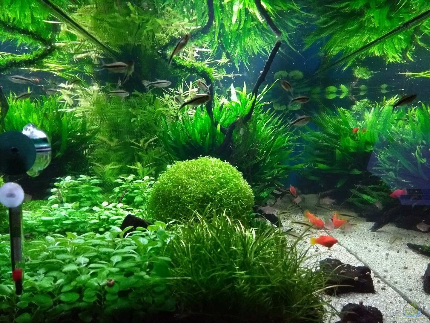Die Abmessungen des Beckens sind entgegen dem aktuellen Aquascaping-Trend, bei dem die Becken eher hoch als breit sind, mit einer Tiefe von 50cm und einer Höhe von ca. 42cm genau richtig, zur Erzielung einer guten Tiefenwirkung. Das Gewicht des Beckens ist gemä?? alter DIN 1055 noch stellbar in einer Mietwohnung ohne Nachweise (Stahlbetondecke). Das Aquarium wird nach einem Umzug gegenwärtig als Biotop-Aquarium neu eingerichtet. Die Bilder zeigen noch das alte Aquarium.