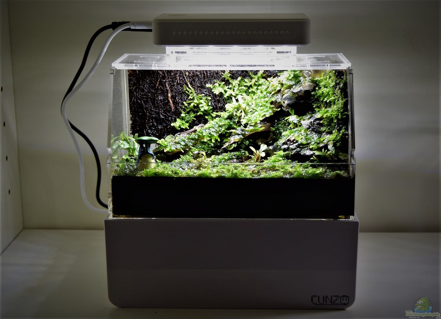 Das Becken ist mit Pumpe, Licht und Heizstab ausgestattet und wird als kleinstes Paludarium der Welt verkauft. Der obere Teil besteht aus einem Acrylbecken mit Lichteinheit und schräger Abdeckscheibe. Der Ablauf ist so angebracht, dass ein 3 cm hoher Wasserstand entsteht, den man als Wasserfläche oder wie in meinem Fall als Sumpf nutzen kann.