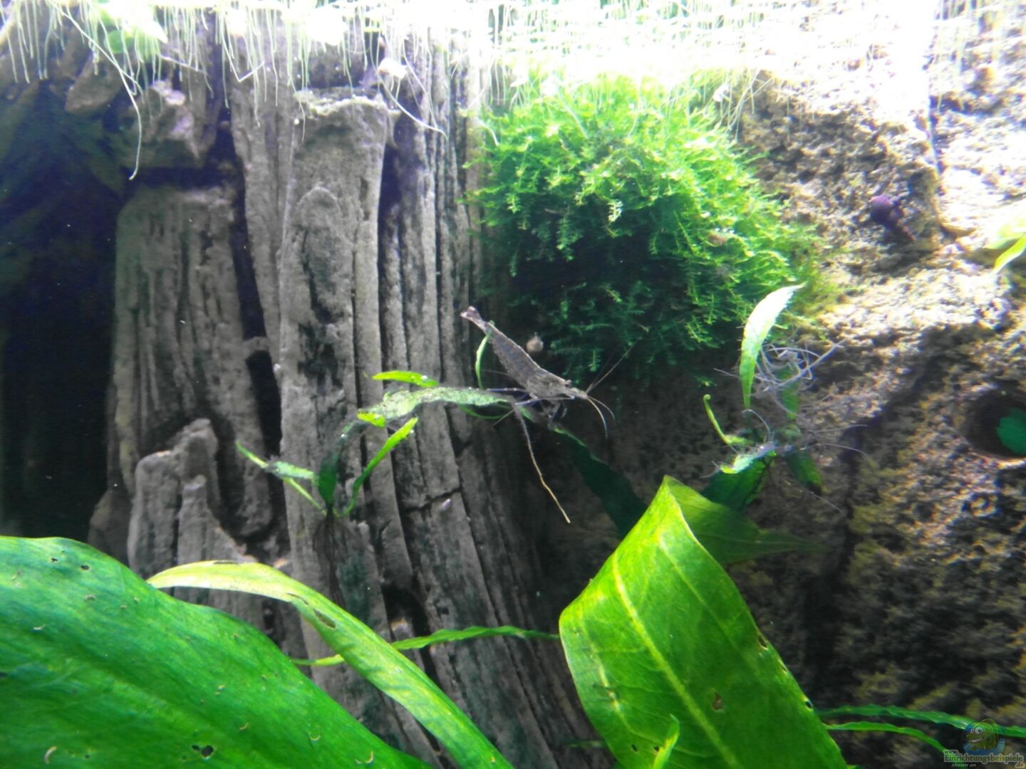 Hinterschwimm, kriech- und krabbelbare Rückwand, welche an den unteren und seitlichen Kanten nur punktuell mit JBL Haru verklebt wurde. Das Wasser kann somit u.a. durch die entstandenen "Verklebelücken" zirkulieren. Darüber hinaus ist der hintere Bereich der Rückwand durch einen 7 x 5 cm gro??en Durchgang zugänglich, welcher sich im linken unteren Bereich befindet. Auch hier gelangt Wasser hinter die Rückwand um einem Stillstand des Wassers entgegen zu wirken.