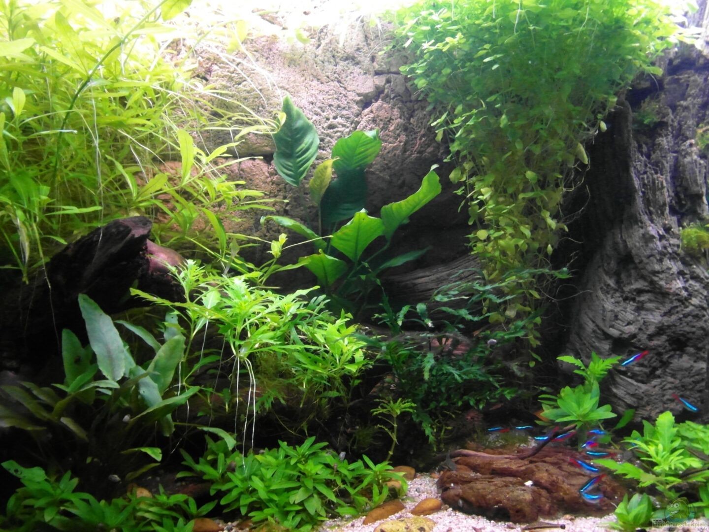 Hinterschwimm, kriech- und krabbelbare Rückwand, welche an den unteren und seitlichen Kanten nur punktuell mit JBL Haru verklebt wurde. Das Wasser kann somit u.a. durch die entstandenen "Verklebelücken" zirkulieren. Darüber hinaus ist der hintere Bereich der Rückwand durch einen 7 x 5 cm gro??en Durchgang zugänglich, welcher sich im linken unteren Bereich befindet. Auch hier gelangt Wasser hinter die Rückwand um einem Stillstand des Wassers entgegen zu wirken.
