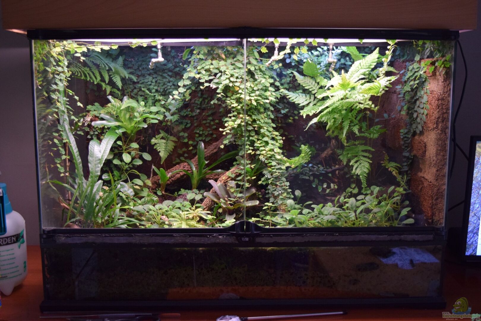Die Rückwand besteht aus ca. 1-2 cm dicken Xaximstücken, die ich mit Aquariensilikon ans Glas geklebt hab. Zwischenräume wurden belassen. Diese hab ich anschliessend mit einem RFB-Substrat ausgefüllt. Das ist eine klebrige Masse aus Klebstoff und Torf, die einfach ans Glas gedrückt wird. Danach muss es ca. ne Woche trocken. Aus ihm wachsen mit der Zeit Moose und Farne.RFB-Substrat Xaxim (gesprochen Schaschim), ist der neuseeländische Baumfarn, den man in Scheiben geschnitten u.a. hier [...]
