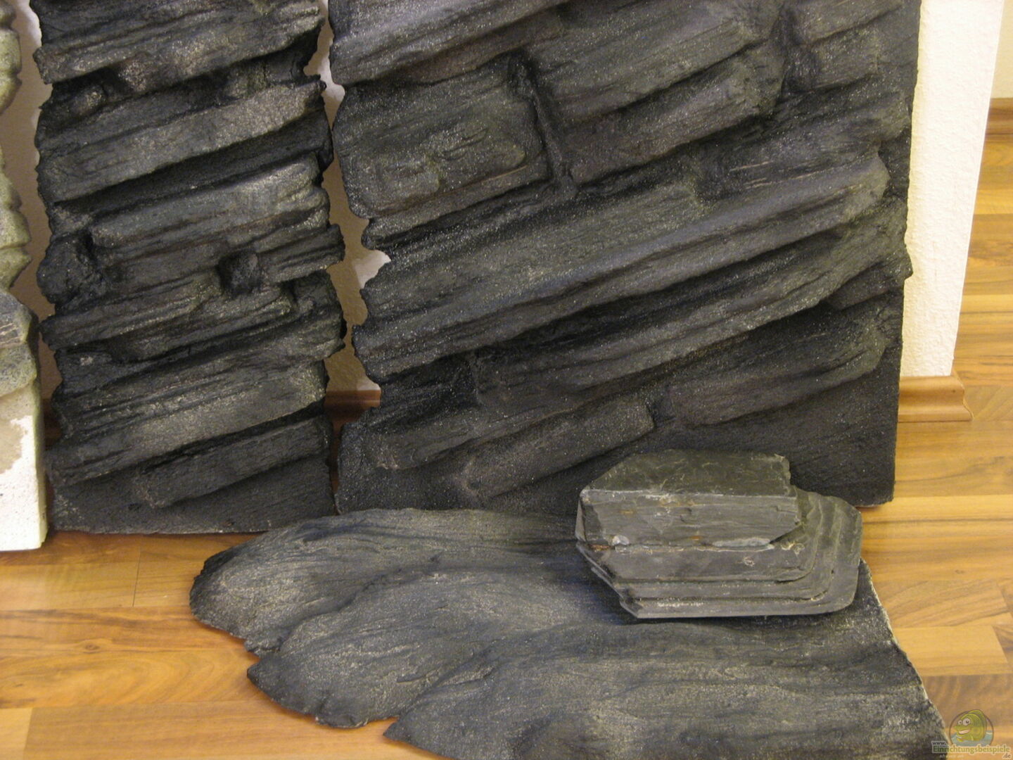 Rückwand/Steine: Momentan 3 Rückwandmodule aus Styropor und Fliesenkleber mit Graniteffekt Lack Sprühfarbe dunkelgrau und Sprühfarbe matt schwarz farblich abgerundet. Dies soll eine Sedimentsgesteinsfolge in Schieferoptik suggerieren. Weiterhin ein ebenso farblich gestaltetes, bereits als gekauft existentes und modifiziertes Felsmodul als Bodenmodul. Alles mit Kunstharz versiegelt. 5 Schieferstücke schwarz von Orbit. Da werden noch weitere folgen. Die Steinspalten in der Rückwand in [...]