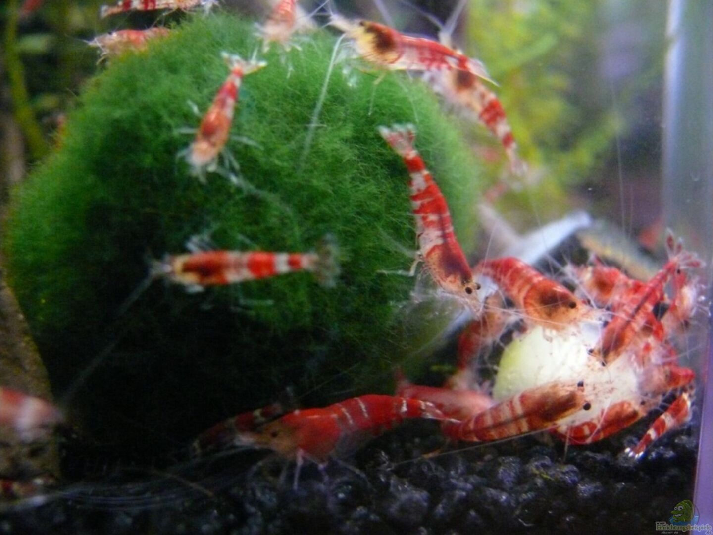 8 Caridina cf. cantonensis ´Crystal red´ (Kristallrote Zwerggarnelen) TDS 2 Geweihschnecken (Clithon sp.), 1 x braun, 1 x gelb gestreift