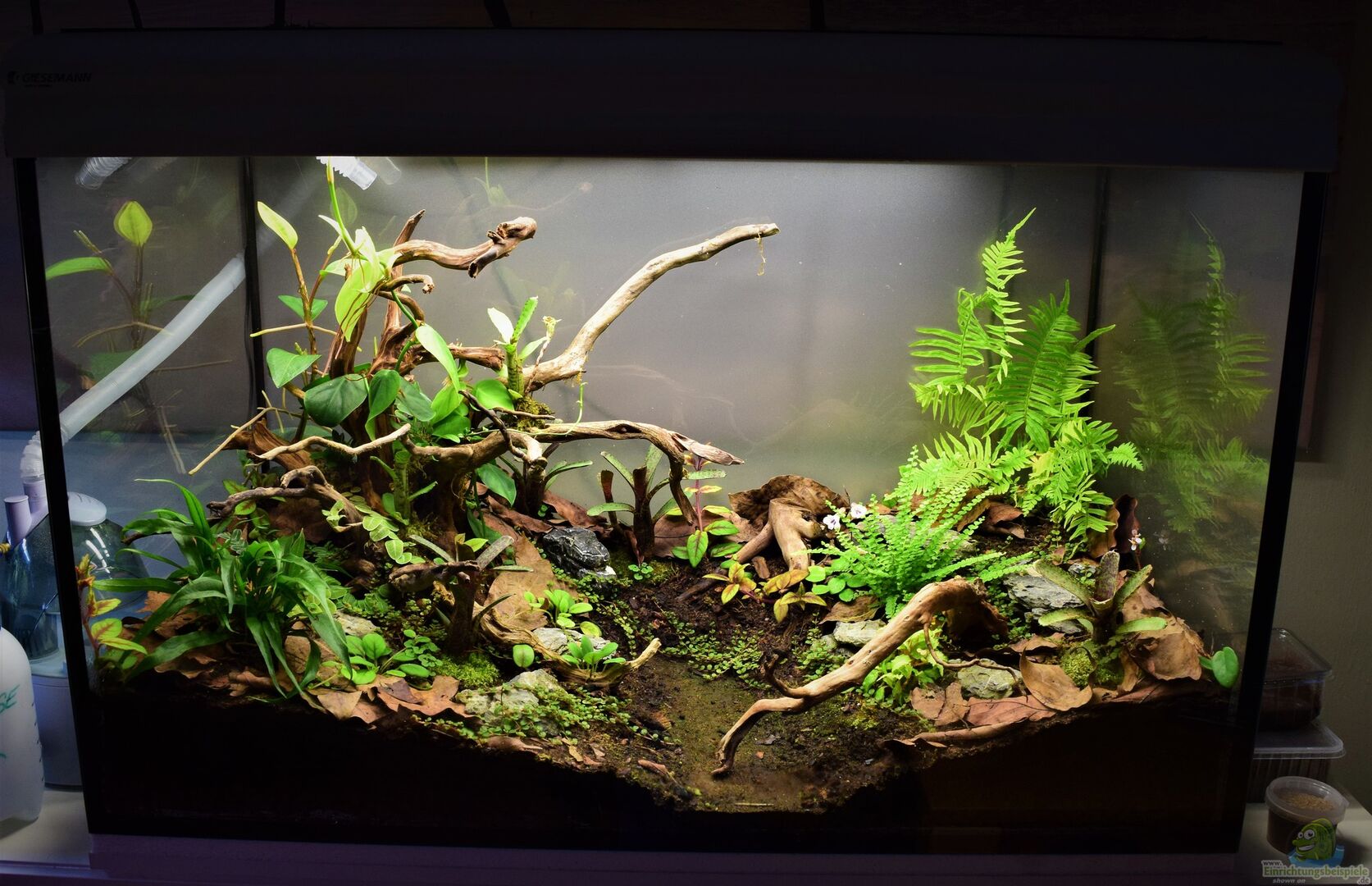 Die Besonderheit liegt darin, dass hier ein Aquarium als Terrarium gestaltet wird. Da kein Luftaustausch von unten nach oben durch Lüftungsschlitze stattfinden kann, wird hier mit PC-Lüftern gearbeitet, um dies zu bewerkstelligen. Der Gedanke war, freie Sicht auf das Terrarium zu haben, ohne störende Schiebscheiben, Lüftungsschlitze o.ä.