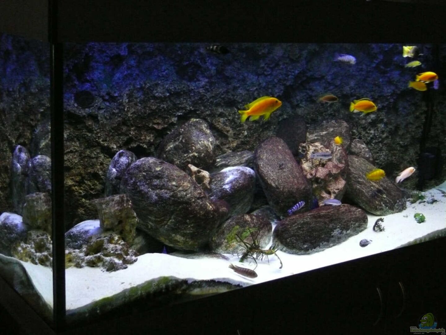 Sonderanfertigung von Amazonas Aquarium aus Reutlingen. Abdeckung von Seaqualux aus Aluminium. Becken ist in 12mm Glas und Stossverklebt mit Sicherheitsnaht und Mittelsteg. Frontscheibe aus Weissglas. Unterschrank ist vom Schreiner angefertigt in Silber, mit ABS-Kanten und Kiesblende.