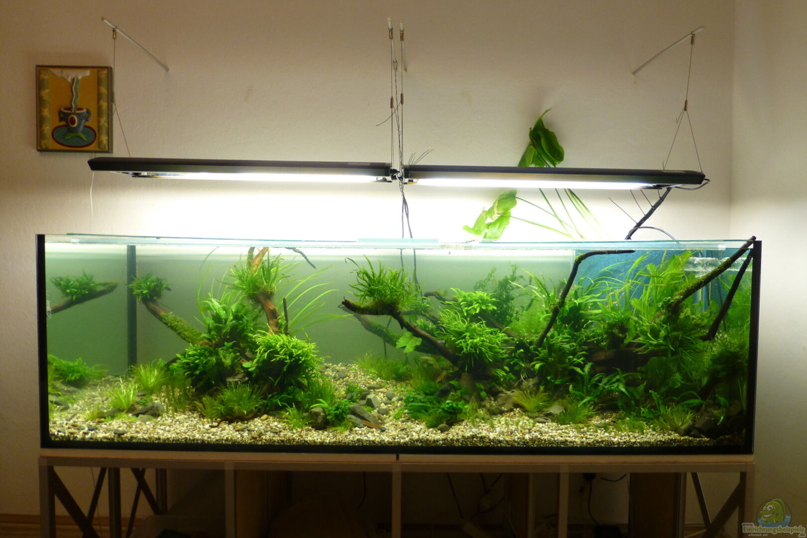 Das Becken ist eine Sonderanfertigung aus 12mm starken Floatglas, diamantgeschliffen und auf Sto?? verklebt. Leer wiegt es 145kg und es dauerte 20min bis es im 3.OG auf dem Schrank stand. Im rechten Bereich wurden jeweils zwei schmale Glasstreifen (Dicke 5mm) zur Aufnahme der Filtermatte des HMF eingeklebt. Zur Stützung der Matte gegen den Kies wurden auf der Bodenplatte senkrecht drei 8cm hohe Gleisstreifen gleicher Dicke geklebt. Zwischen diesen senkrechten ???Platten??? sind Spalte, sodass [...]