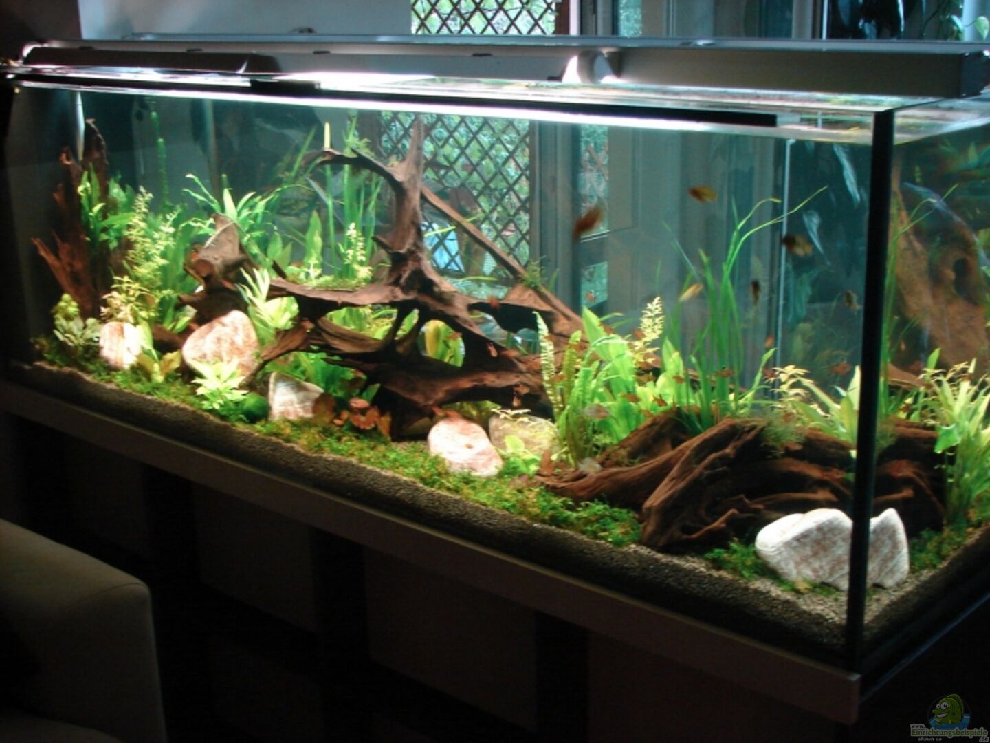Das Becken ist als Raumteiler im Wohnzimmer aufgestellt. Es befinden sich an der linken Stirnseite, zur Wand hin, 2 Bohrungen mit 28mm Durchmesser und Tankverschraubungen für 20mm PVC-Rohre.