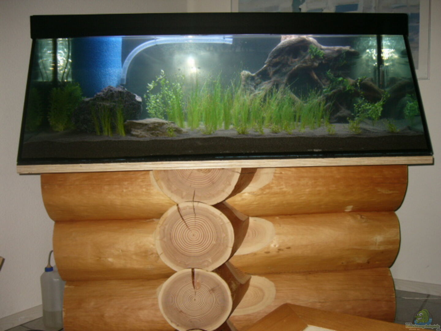 spezielle form durch die schräge frontscheibe unten 60cm breit und oben 40cm breit. das becken steht auf einer selbstgebauten rundholz konstrucktion.