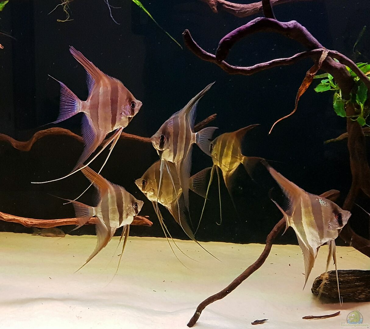 Der Besatz besteht aus: - 13 Orinoco Altum der Siegrist Linie. Diese stammen wohl ursprünglich aus dem Rio Inirida. Diese Linie zeichnet sich aus durch einen schwächeren Nasenknick und längere Flossen. Die Flossen sind leicht rose/rötlich. - 15 Metallpanzerwelsen - 3 Sturisoma Aureum - 3 L134