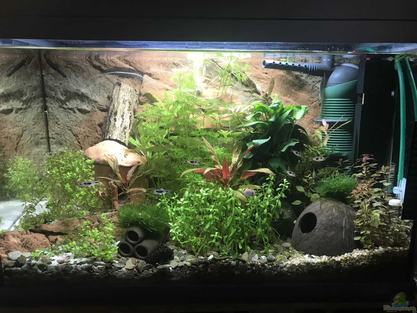 Eingeklebte Juwel-Rückwand "Cliff Dark". Absatz aus einem Stück Rückwand damit sich der Sand nicht mit dem Kies vermischt.